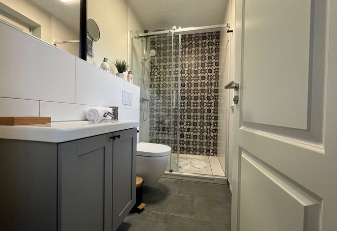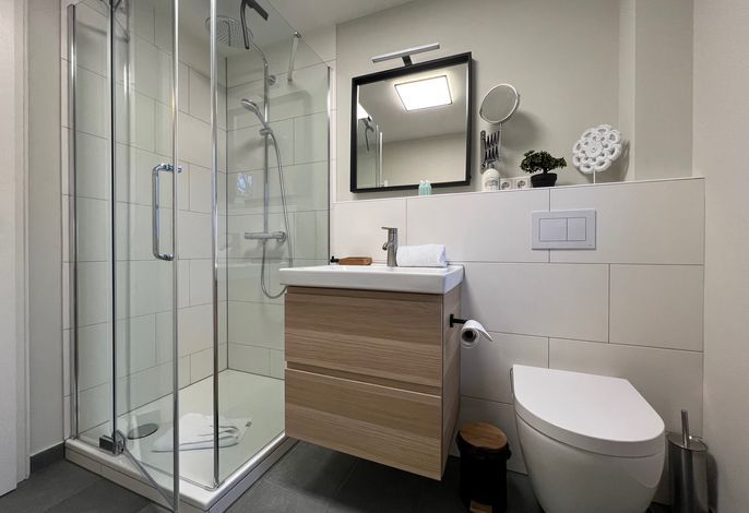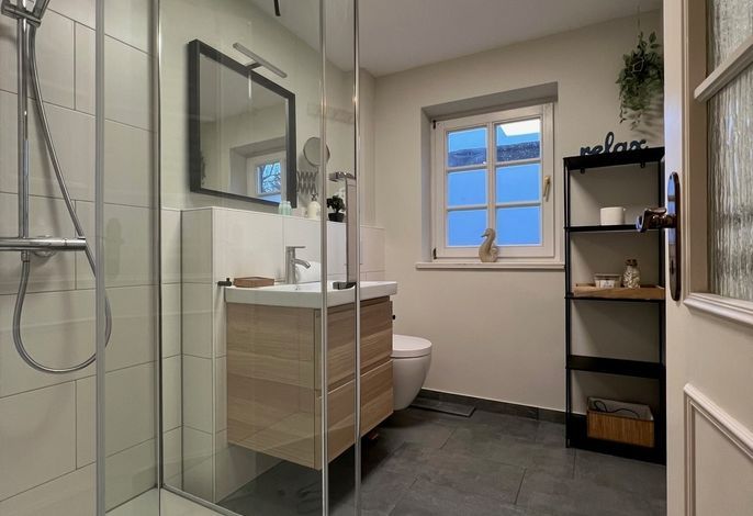 Beide Bäder sind mit einer Dusche mit Rainshower und Fussbodenerwärmung ausgestattet. Das Bad im 1. OG verfügt dazu noch über einen Handtuchhalterheizkörper.