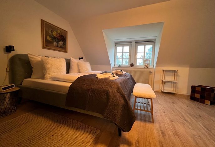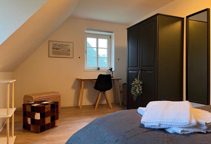 Das Hauptschlafzimmer im 1. OG verfügt über ein 180x200 cm Doppelbett und einen Schreibtisch direkt unter dem Fenster.