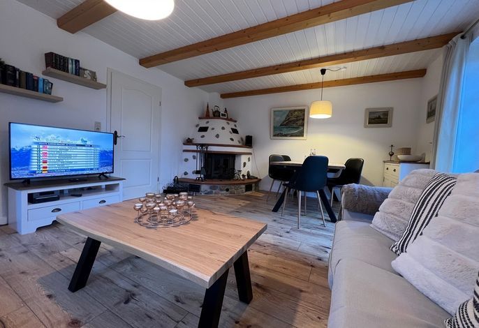 Das Wohnzimmer im Erdgeschoss hat einen Smart-TV, einen Kamin sowie Gesellschaftsspiele und Bücher.