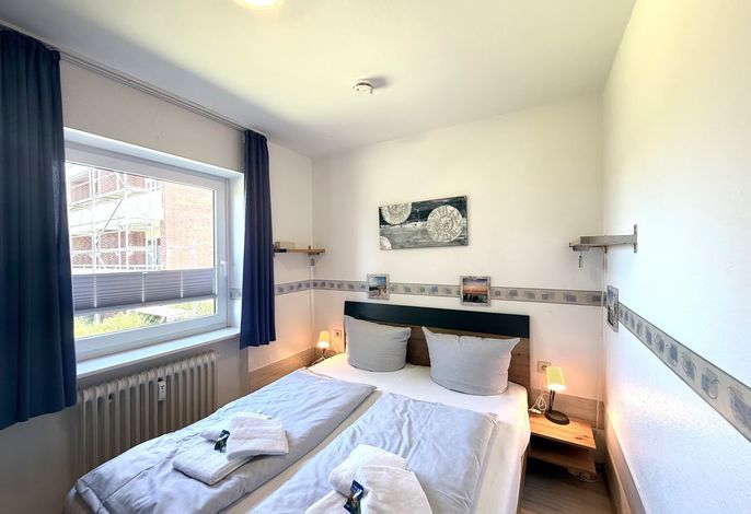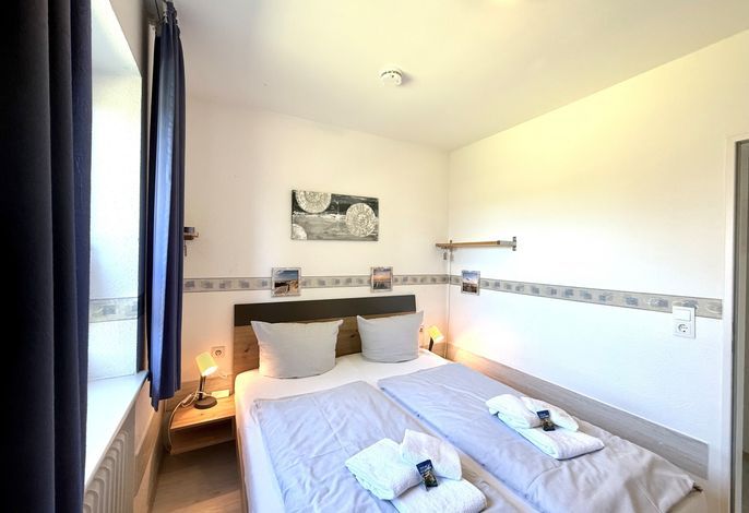 Ein separates Schlafzimmer mit Doppelbett und einem großzügigen Kleiderschrank bietet einen Rückzugsort für die Nacht. Für eine dritte Person kann das Schrankbett im Wohnzimmer mit wenigen Handgriffen aufgeklappt werden.
