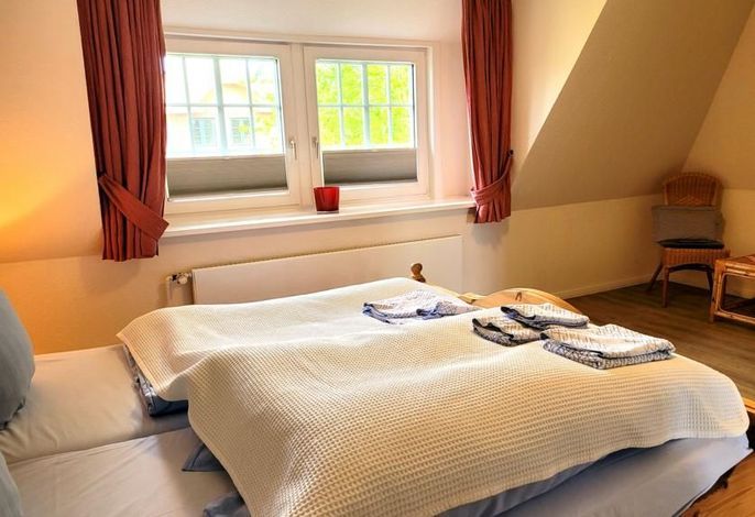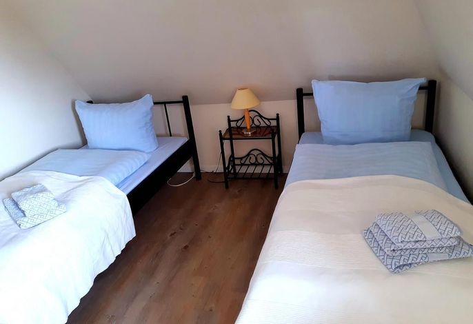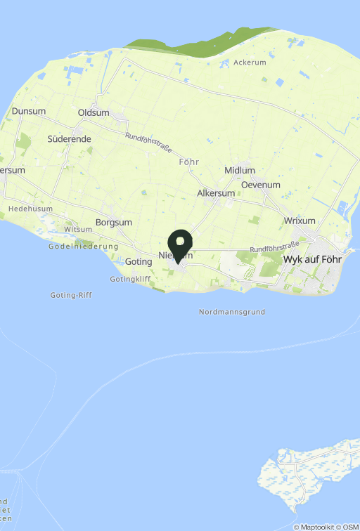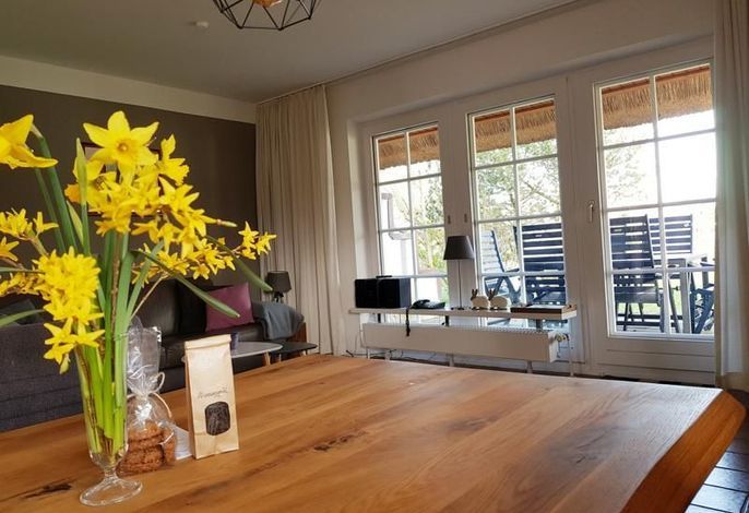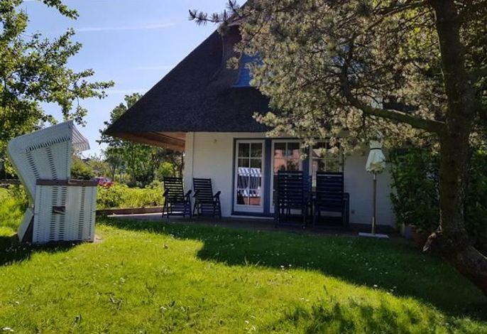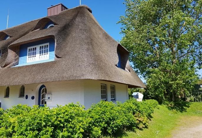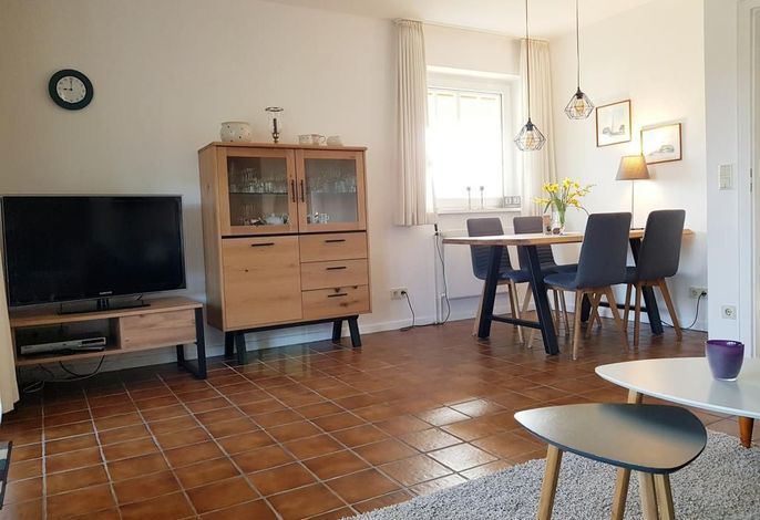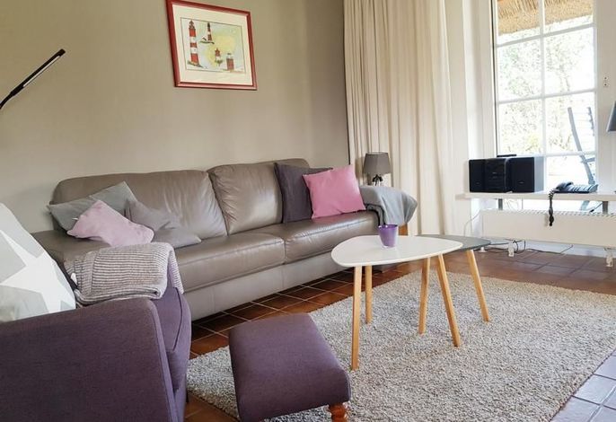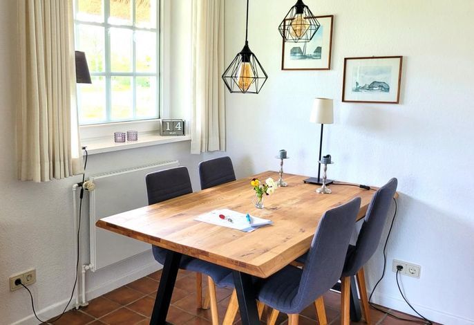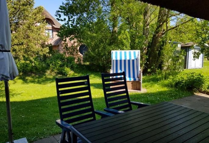 Das Reihenendhaus im friesischen Stil liegt im Hochstieg - einer ruhigen Sackgasse in Nieblum. Im Erdgeschoss gelangt man vom Flur in die Küche, sowie in das Wohnzimmer mit Essecke, als auch zum Gäste-WC.