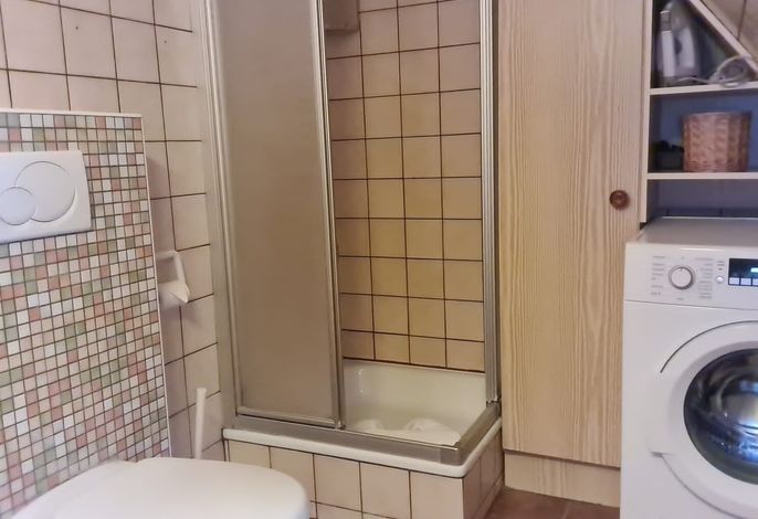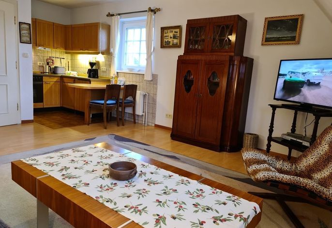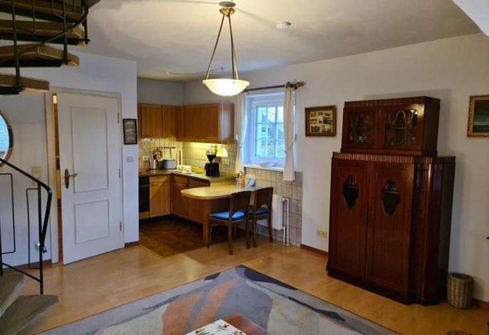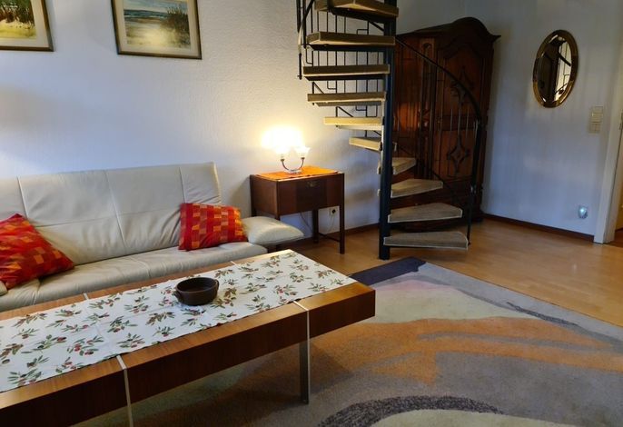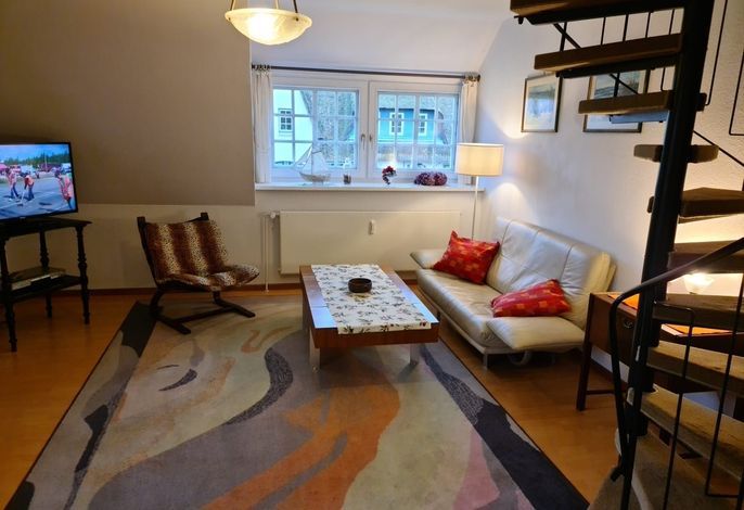 Die Wohnung hat einen kombinierten Wohn- & Essbereich, eine komfortabel eingerichtete Eck-Küchenzeile mit Herd, Backofen, Toaster, Kaffeemaschine und weiteren Küchenutensilien, sowie ein Duschbad mit Waschmaschine. Über eine kleine Treppe gelangen Sie in den Schafbereich mit Doppelbett und Einbauschränken, die viel Platz bieten. Im Wohnzimmer steht ein Flachbild-TV zur Verfügung. Ab 05/2014 können Sie einen kostenfreien WLAN Anschluss nutzen.