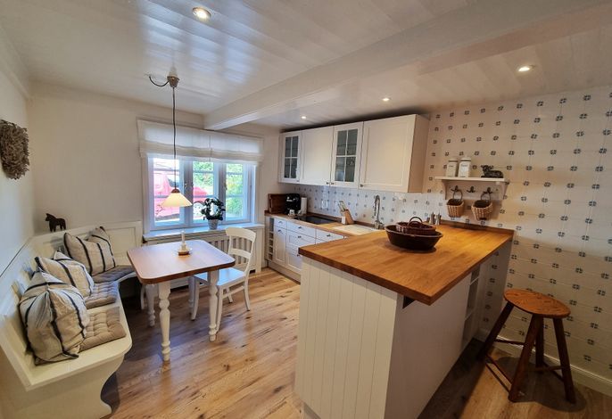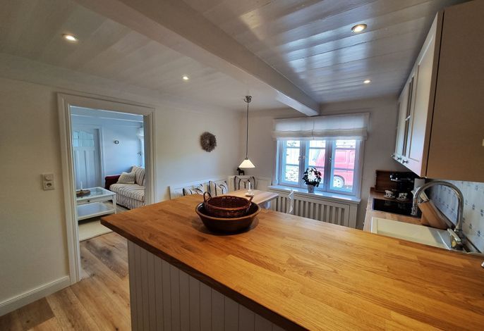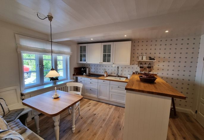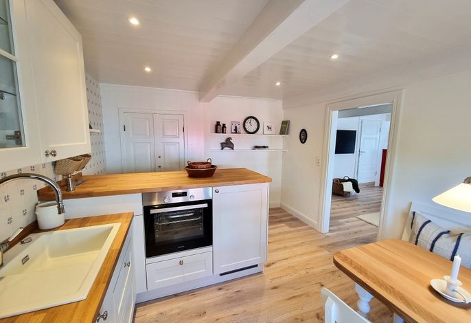 Vom Wohnzimmer gelangen Sie direkt in die separate Küche. Diese ist ausgestattet mit einem Backofen, Mikrowelle, Nespresso- Maschine und allem, was man zum Kochen braucht. In der Küche gibt es eine gemütliche Einbausitzecke, die zum Verweilen und Klönen einlädt.