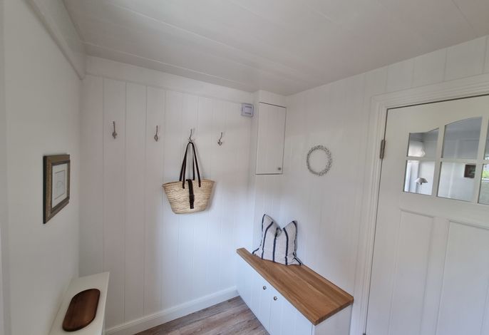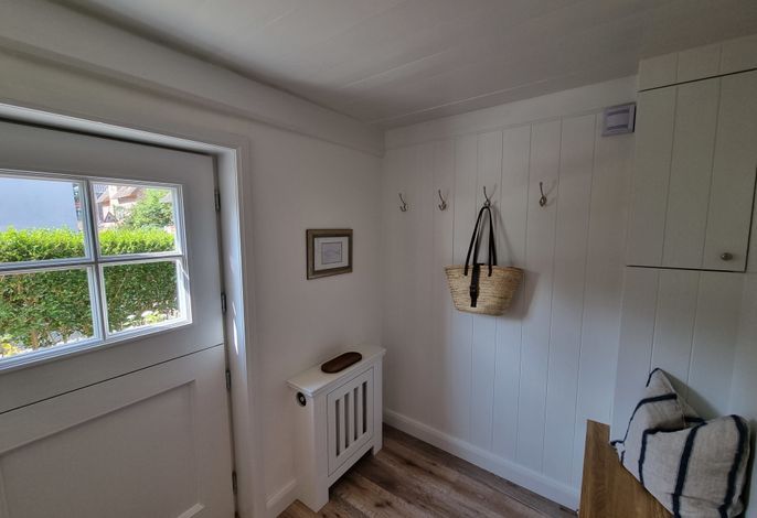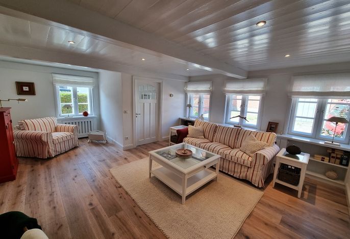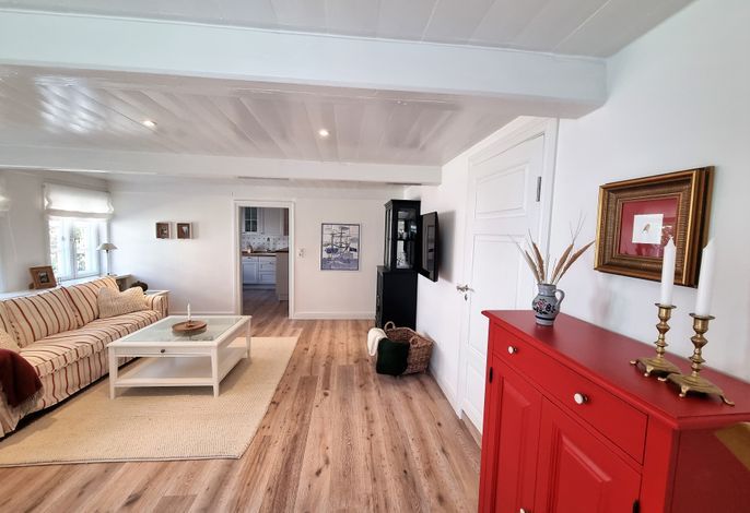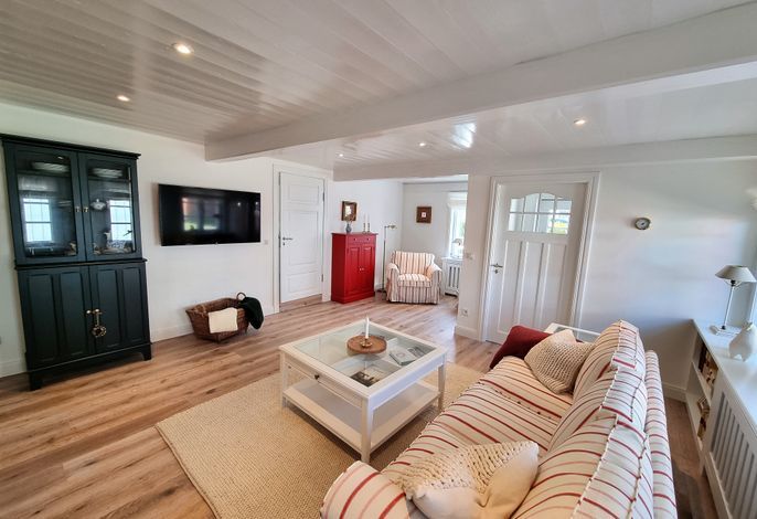 Die Wohnung bietet Platz für 2 Personen auf 60 qm und ist komplett ebenerdig. Durch den eigenen Hauseingang gelangen Sie in einen Vorflur mit Garderobe und kleiner Sitzbank in das freundliche Wohnzimmer. Ein Highlight sind die original erhaltenen friesischen Wandfliesen und Holzdecken. Neben einer gemütlichen Couch und einen Flachbildfernsehr, haben Sie eine schöne Leseecke direkt am Fenster.