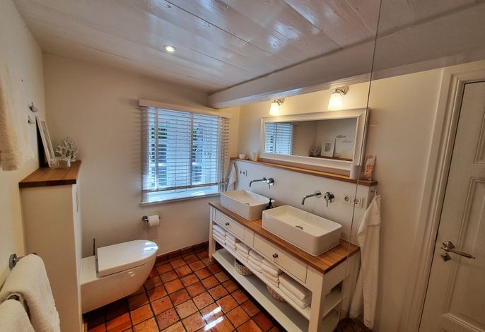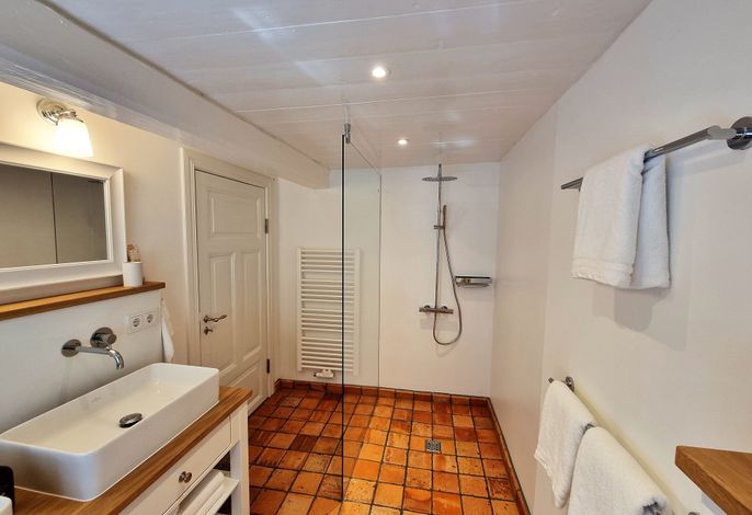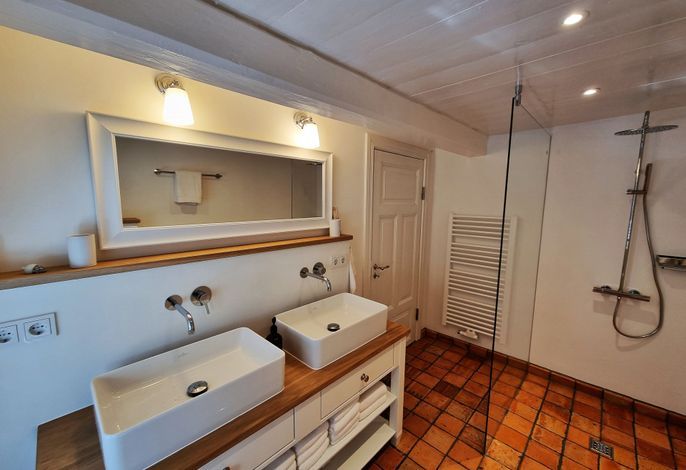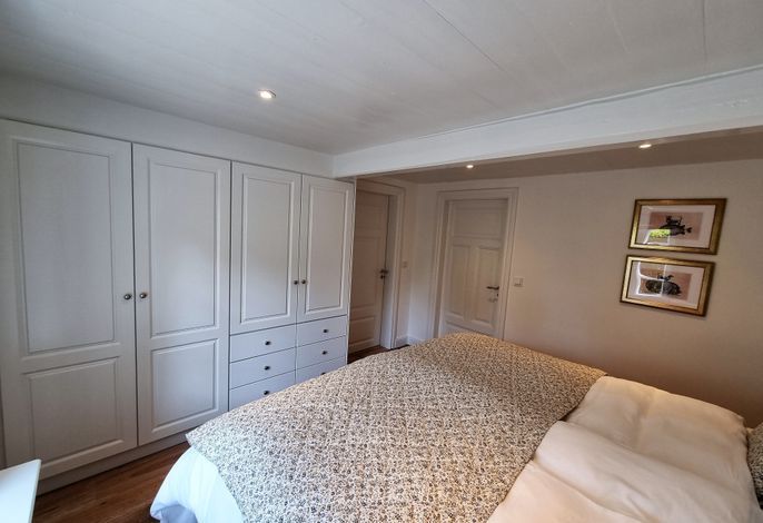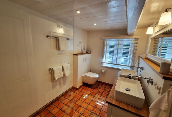 Ebenfalls gelangen Sie vom Wohnzimmer in das Schlafzimmer mit einem Doppelbett und einem Bad en Suite. Im Bad befindet sich ein Doppelwaschbecken, eine ebenerdige Dusche, ein WC und ein Föhn.