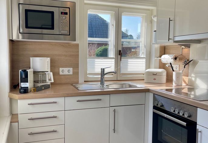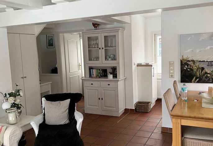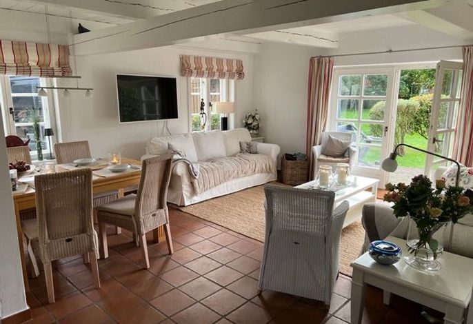 Willkommen im gepflegten Endhausteil Mewes in Borgsum auf Föhr. Im Südteil des reetgedeckten Hauses mit mehreren Hausteilen erwartet Sie eine helle und gemütliche Unterkunft über zwei Etagen.