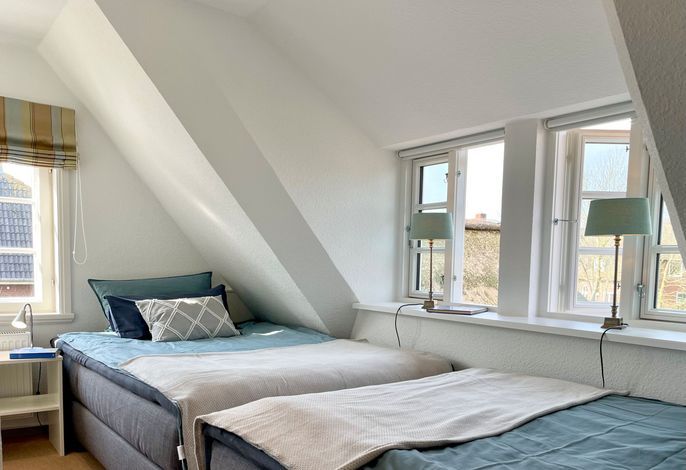 Im Obergeschoss: 1 Schlafzimmer mit Doppelbett , 1 Schlafzimmer mit 2 breiten Einzelbetten, Duschbad/WC.