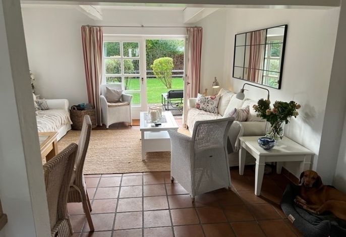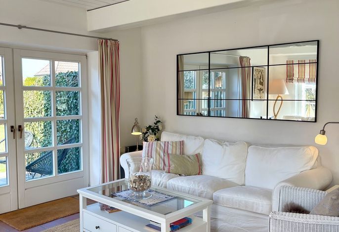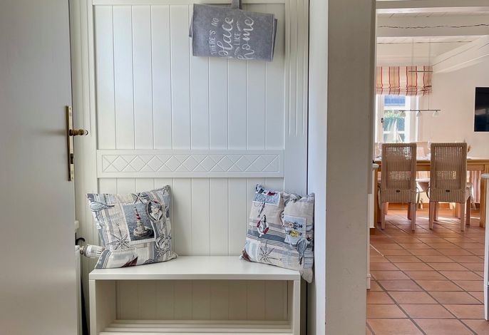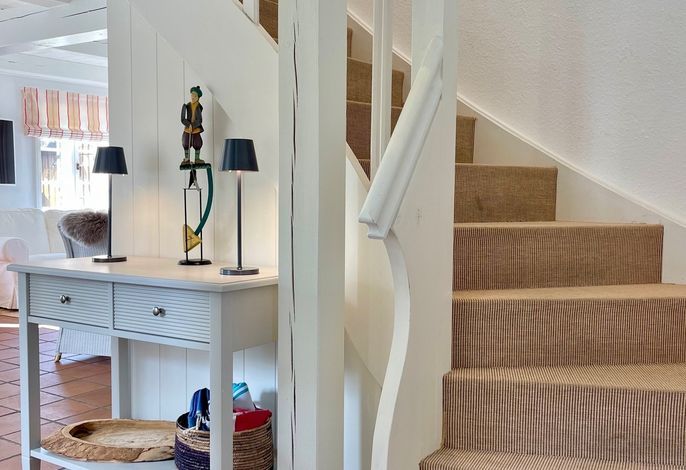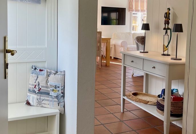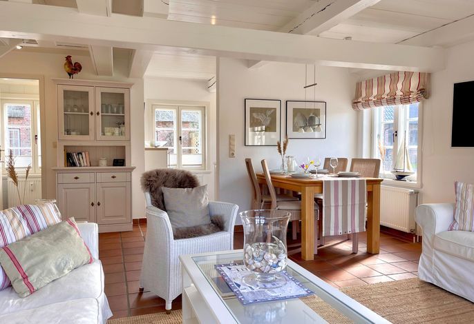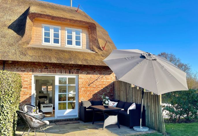 Willkommen im gepflegten Endhausteil Mewes in Borgsum auf Föhr. Im Südteil des reetgedeckten Hauses mit mehreren Hausteilen erwartet Sie eine helle und gemütliche Unterkunft über zwei Etagen.
