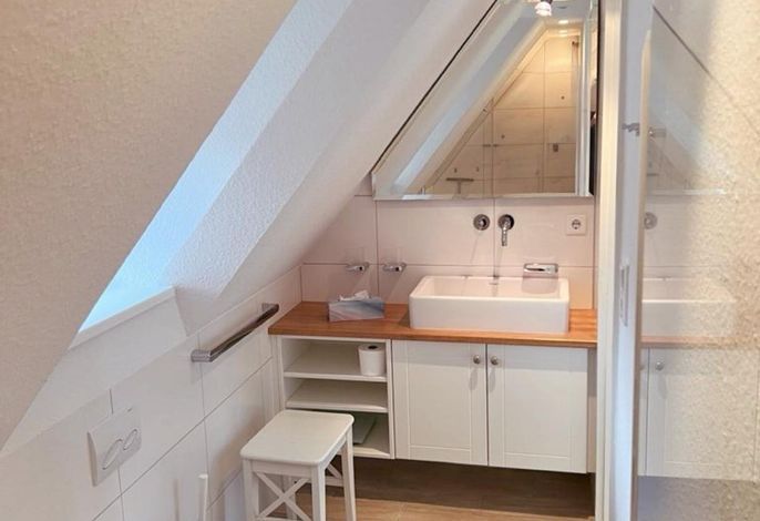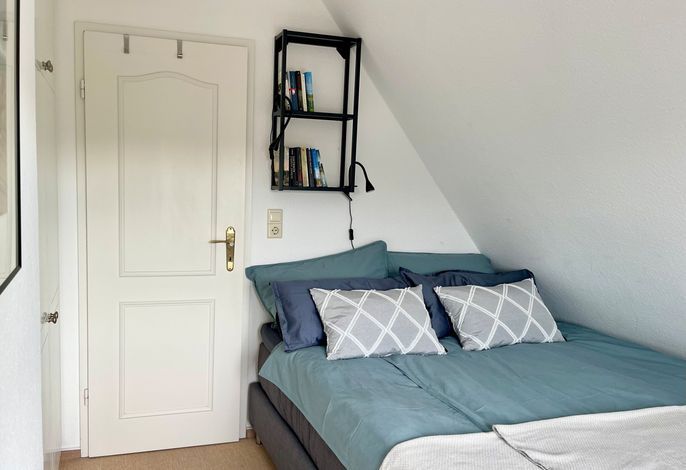 Im Obergeschoss: 1 Schlafzimmer mit Doppelbett , 1 Schlafzimmer mit 2 breiten Einzelbetten, Duschbad/WC.