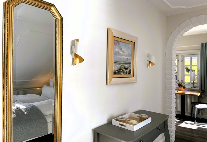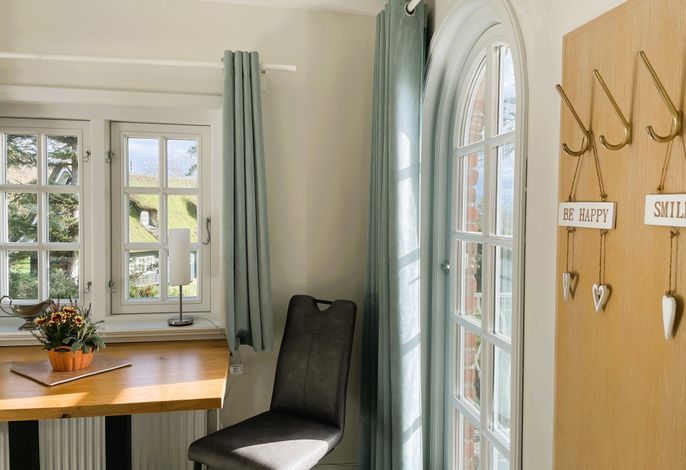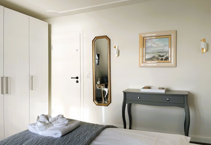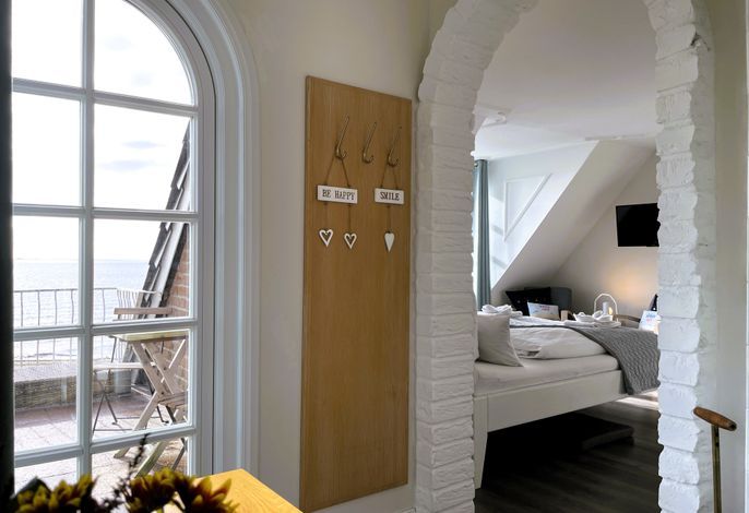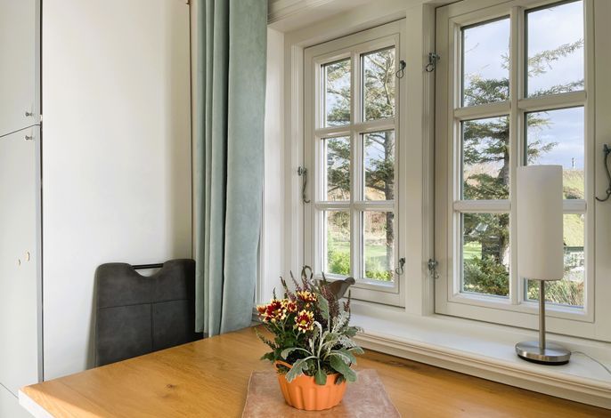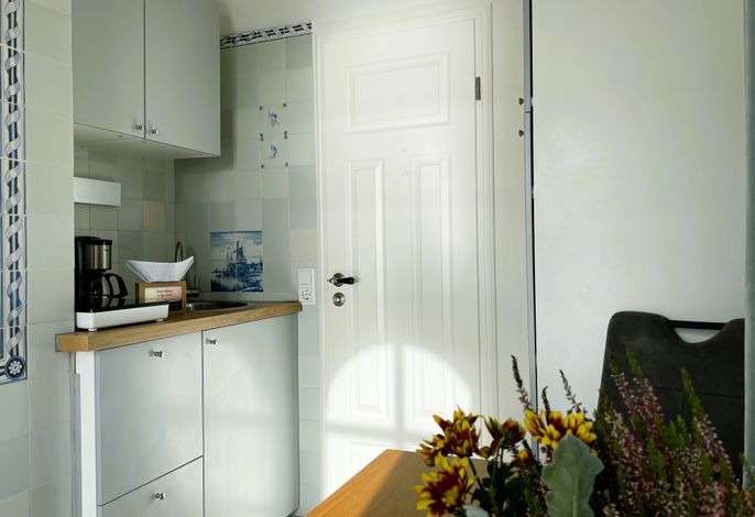 Verbringen Sie eine wundervolle Zeit in der bezaubernden kleinen Amrumblick Diese charmante Ein-Zimmer-Oase vereint Wohnen und Schlafen in einem harmonischen Ensemble, ergänzt durch eine praktische Kochnische und ein kompaktes Badezimmer. Das kuschelige Doppelbett verspricht süße Träume und der geräumigen Kleiderschrank bietet genügend Platz für Ihre Urlaubsgarderobe. Eine kleine aber feine Küchenzeile mit 2-Platten-Induktionskochfeld, Mikrowelle, Kaffeemaschine, Toaster, Kühlschrank mit Gefrierfach und einer kleinen Sitzgruppe mit zwei Stühlen vervollständigen die Einrichtung. Das absolute Highlight der Amrumblick ist der Balkon. Hier offenbart sich Ihnen ein atemberaubendes Panorama über die Nordsee, die Halligen und Amrum. Lassen Sie den Tag bei einem Glas Wein ausklingen und genießen Sie den Sonnenuntergang von Ihrer privaten Aussichtsplattform.