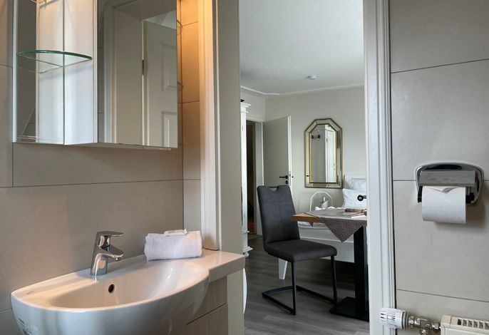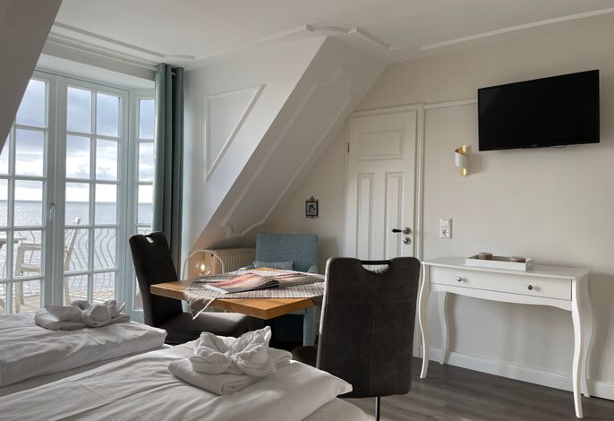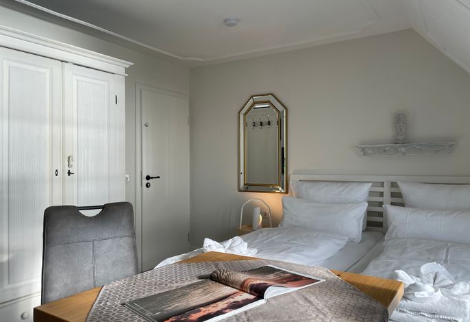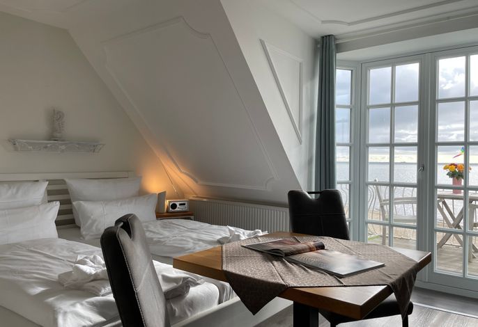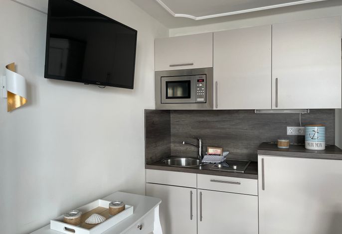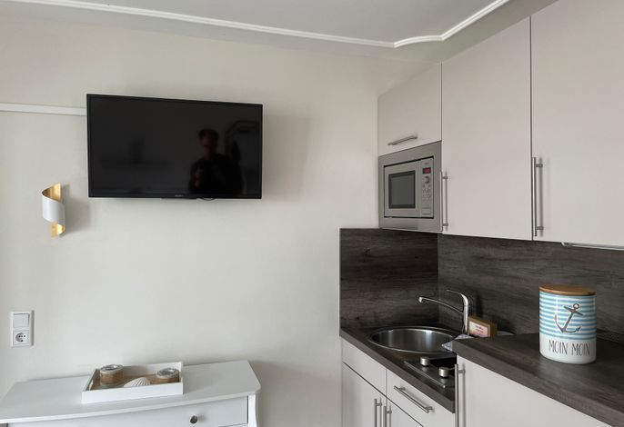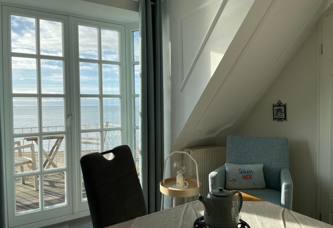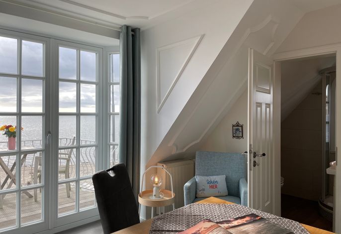 Erleben Sie unvergessliche Momente in diesem charmanten Appartement mit einem einladenden Wohn-/Schlafzimmer. Hier erwartet Sie ein gemütliches Doppelbett, das für erholsame Nächte sorgt, sowie ein praktischer Schrank für Ihre persönlichen Dinge. Der Essbereich mit Tisch und Stühlen lädt zum Verweilen und Genießen ein. Die Mini-Küche verfügt über einen Herd mit zwei Platten, einer Mikrowelle, einem Wasserkocher, Filterkaffeemaschine, Toaster und einem Kühlschrank mit Gefrierfach. Das Badezimmer ist kompakt und funktional gestaltet mit einer Dusche und einem WC. Ein Highlight der Wohnung ist der Balkon, der direkt vom Wohnraum aus zugänglich ist. Hier können Sie bei einer Tasse Kaffee oder einem Glas Wein die herrliche Aussicht auf die Nordsee, die Halligen und Amrum genießen. Der Balkon ist der ideale Ort, um den Tag entspannt ausklingen zu lassen – Ihr perfekter Ort für eine Auszeit an der Nordseeküste wartet auf Sie!