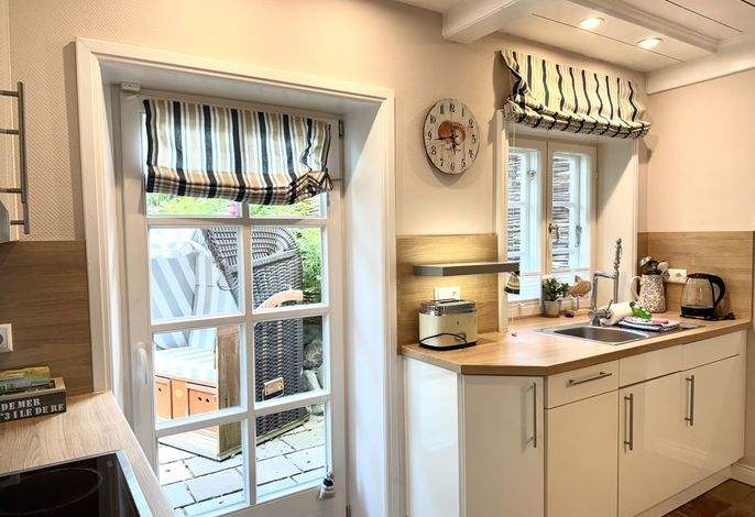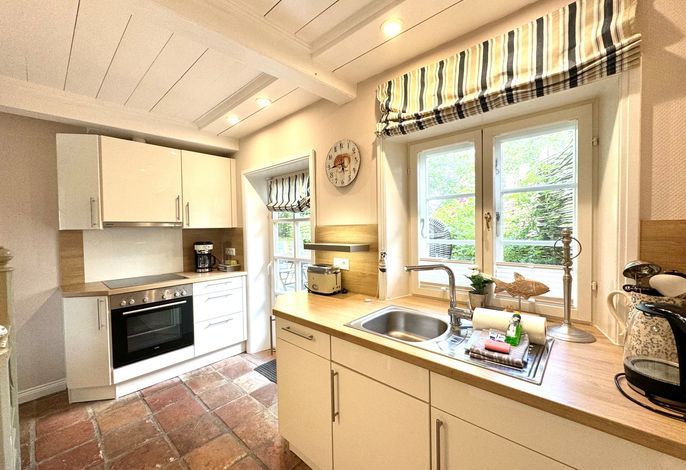 In der gut ausgestatteten Küche finden Sie neben einem Kühlschrank auch eine Mikrowelle und einen Backofen.
