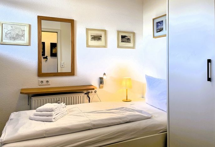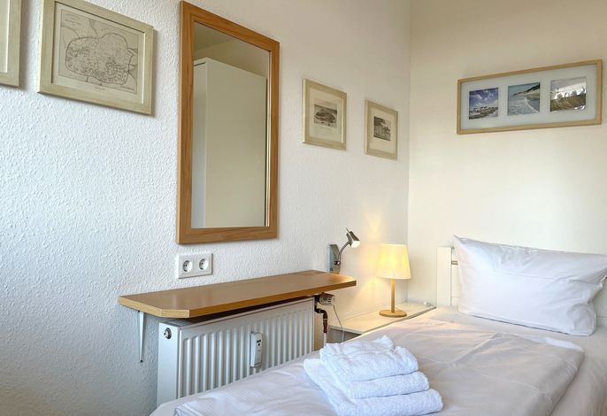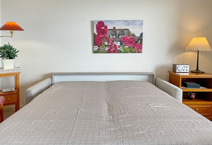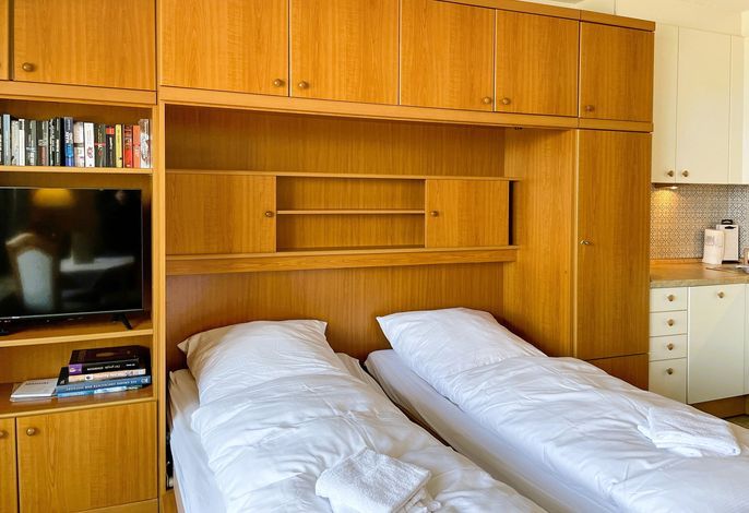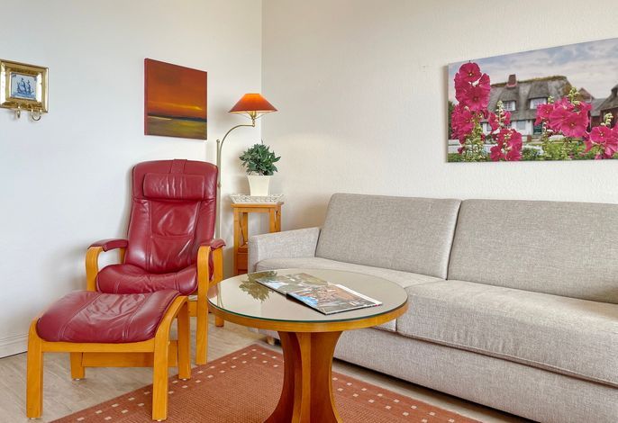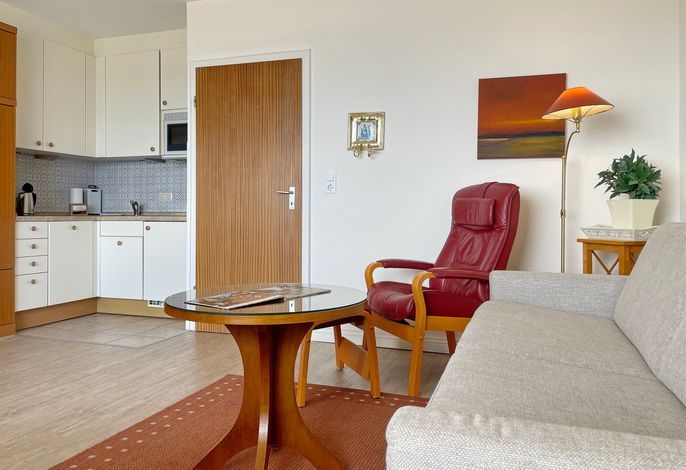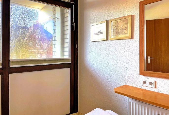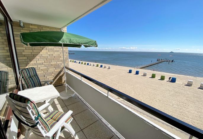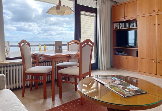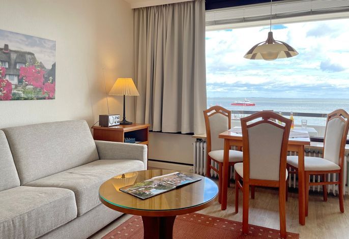 Genießen Sie Ihre Urlaubstage am Meer im Haus Irma und beobachten Sie das Schauspiel von Ebbe und Flut direkt von dem geschützen Balkon. Im Sommer können Sie bequem noch vor dem Frühstück über direktem Zugang vom Haus aus an den Strand und eine Runde Schwimmen oder nach einem erlebnisreichen Urlaubstag den Abend auf dem Balkon mit einem Glas Wein ausklingen lassen, während Sie den Blick auf die abendliche Nordsee genießen. Die Ferienwohnung Irma 16 befindet sich im 2. Stock des Hauses und bietet 2 bis max. 3 Personen Platz für herrliche Urlaubstage. Zur Wohnung kann man über die Treppe oder per Aufzug ( vom Haupteingang über 4 Stufen) gelangen. Vom Flur aus erreichen Sie die einzelnen Räume und gelangen in den Schlafraum mit Einzelbett (90x190cm), einem Schrank und einer Leseecke und in das Duschbad mit kleinem Fenster sowie in den Wohnbereich mit integrierter Essecke und Küchenzeile. Von hier aus gelangen Sie auch auf den windgeschützten Balkon, der herrlichen Meerblick anbietet. Der helle Wohnraum besteht aus einer zweckmäßigen Küchenzeile mit 4-Plattenherd. Kühlschrank mit Gefrierfach, Geschirrspüler und einer Mikrowelle mit Grillfunktion sowie Wasserkocher und einer Filterkaffeemaschine. Die gemütliche Essgruppe steht direkt an der großen Fensterfront, welche einen einmaligen Blick auf das Meer und die Halligen ermöglicht. Die Sitzgruppe mit Flachbild-TV, WLAN und Stereoanlage ist freundlich eingerichtet. Des Weiteren befinden sich im Wohnzimmer zwei Schrankbetten, so können Sie im Sommer bei offener Balkontür mit frischer Nordseeluft traumhafte Nächte erleben. Alle wichtigen Versorgungseinrichtungen wie Bäcker, Supermarkt usw. befinden sich in unmittelbarer Nähe. Das Zentrum von Wyk sowie das Meerwasserwellenbad AquaFöhr erreicht man zu Fuß in wenigen Minuten. Im Keller des Hauses stehen Waschmaschine und Trockner gegen eine geringe Gebühr zur gemeinschaftlichen Nutzung zur Verfügung. Es besteht ein direkter Zugang zum Strand, der von Ostern bis Ende Oktober (wetterabhängig) geöffnet ist. Genießen Sie den herrlichen Blick auf den Strand und das Meer direkt von Ihrem Balkon oder Ihrer Terrasse aus.