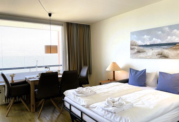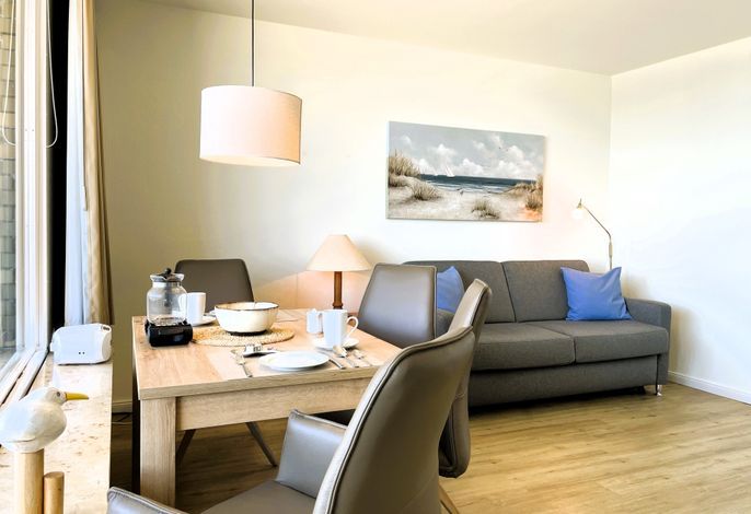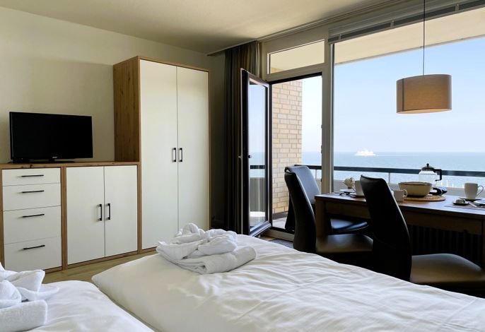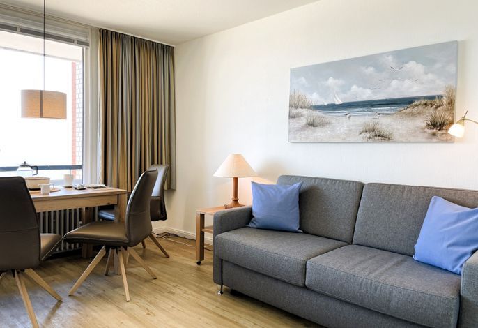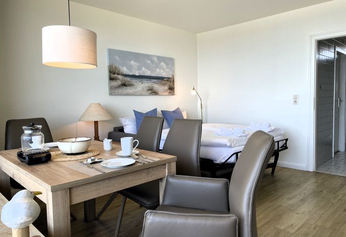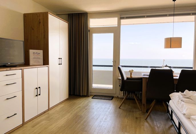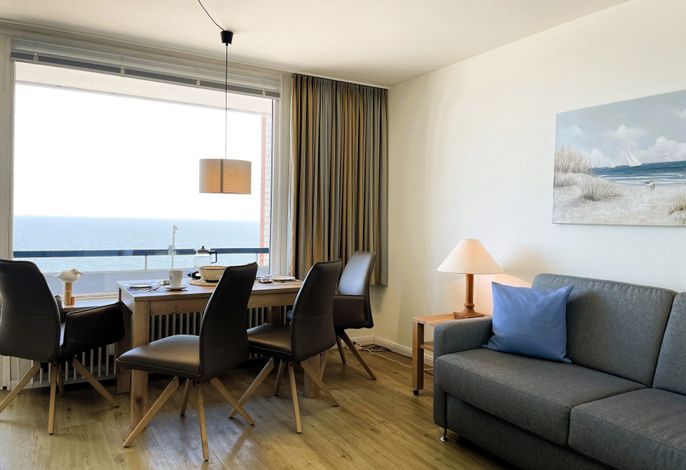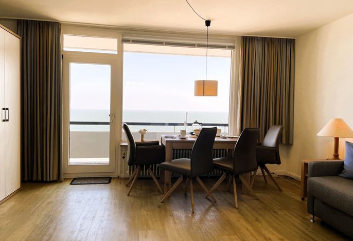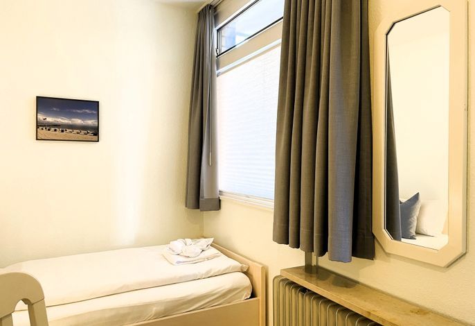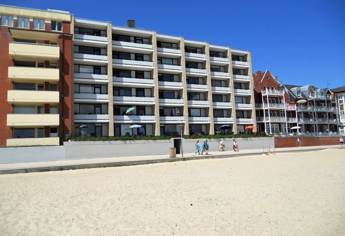 Im Keller des Hauses stehen Waschmaschine und Trockner gegen eine geringe Gebühr zur gemeinschaftlichen Nutzung zur Verfügung. Genießen Sie den herrlichen Blick auf den Strand und das Meer direkt von Ihrem Balkon oder Ihrer Terrasse aus. Genießen Sie Ihre Urlaubstage am Meer im Haus Irma und beobachten Sie das Schauspiel von Ebbe und Flut direkt von dem geschützen Balkon. Im Sommer können Sie bequem noch vor dem Frühstück über direktem Zugang vom Haus aus an den Strand und eine Runde Schwimmen oder nach einem erlebnisreichen Urlaubstag den Abend auf dem Balkon mit einem Glas Wein ausklingen lassen, während Sie den Blick auf die abendliche Nordsee genießen. Unsere Wohnung Irma 24 befindet sich im dritten Stock des Hauses und ist sportlich per Treppe oder auch bequem mit einem Aufzug (4 Stufen bis zum Aufzug) erreichbar. Sie bietet Platz für 2, max. 4 Personen, und verfügt über ein Schlafzimmer mit zwei Einzelbetten (90x190cm) und großzügigem Schiebetürenschrank sowie einem hellgefliesten Bad mit Dusche und kleinem Fenster. Der Wohnbereich mit zweckmäßig eingerichteter Küche mit Ceranfeldherd, Kühlschrank mit Gefrierfach, Mikrowelle mit Grillfunktion, Wasserkocher und Senseo Duo Kaffeemaschine (Pad und Filterkaffee möglich) ist hell und verführt mit der breiten Glasfront, die direkten Blick auf Strand und Meer freigibt. Eine gemütliche Essecke und eine bequeme Sitzgruppe mit Flachbild- TV, WLAN und CD-Player vervollständigen den Wohnbereich. Eine Schlafcouch (140 x190 cm) bietet die weitere Schlafgelegenheiten, wenn Sie mit 4 Personen anreisen. Vom Wohnzimmer gelangen Sie direkt auf den Balkon, welcher im Sommer mit Gartenmöbeln zum Verweilen einlädt. Erleben Sie traumhaft schöne Tage auf Föhr.