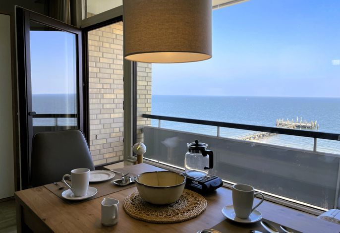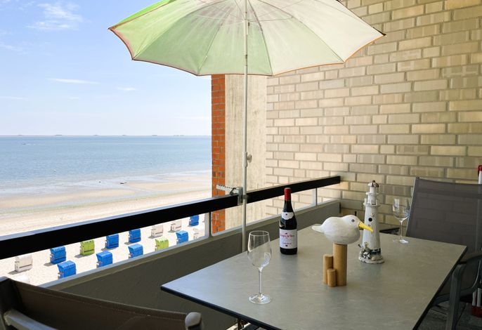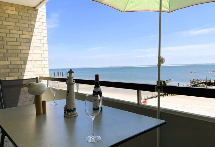 Windgeschützt in der Logia des Hauses Irma am Sandwall in Wyk genießen Sie bei jedem Wetter die Aussicht auf den Strand und das Wattenmeer. Ein besonders schöner Moment ist, wenn die Sonne am Meereshorizont erwacht..Traumhafter...