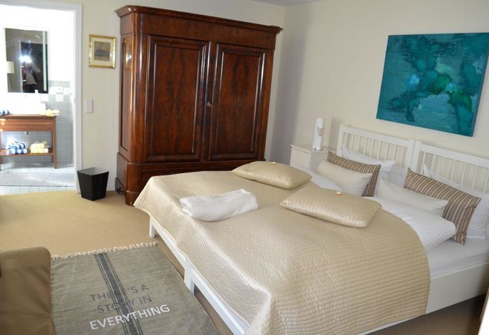 Die Ferienwohnung bietet eine komfortable und gut ausgestattete Unterkunft für jeden Aufenthalt. Sie ist barrierefrei und allergikergeeignet, was den Bedürfnissen vieler Gäste gerecht wird. In einem separaten Bereich befindet sich die moderne Küche, ausgestattet mit einem Geschirrspüler, Elektro-/Gasherd, Backofen, Mikrowelle, Kühlschrank und einer Kaffeemaschine. Der offene Wohnbereich lädt mit einem Sofa und einem Sessel zum Entspannen ein, während die HiFi-Anlage und der TV für Unterhaltung sorgen.