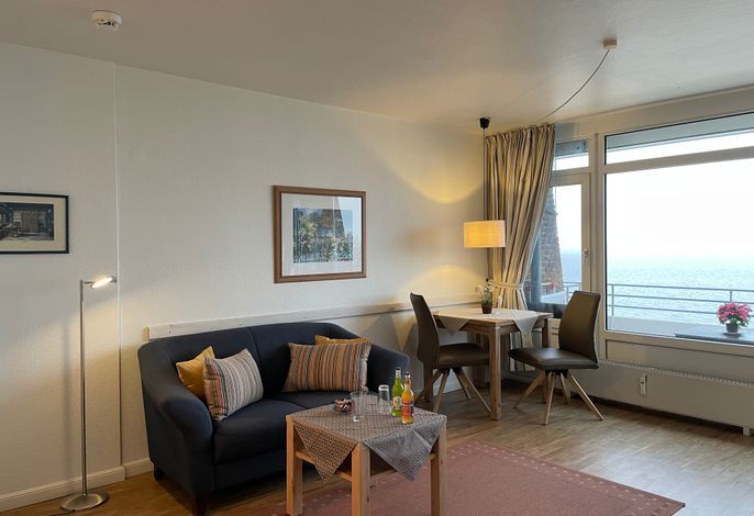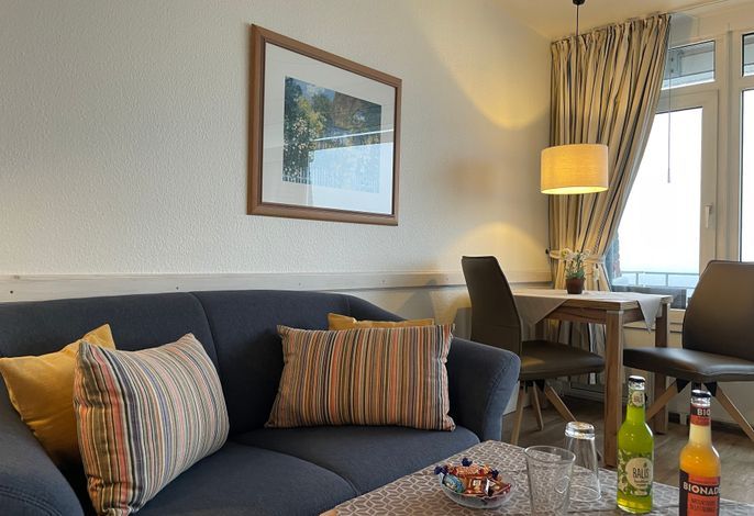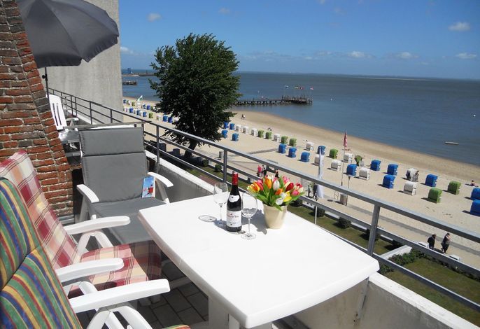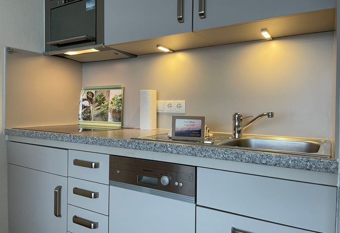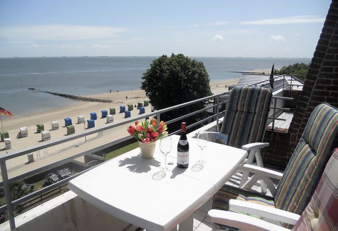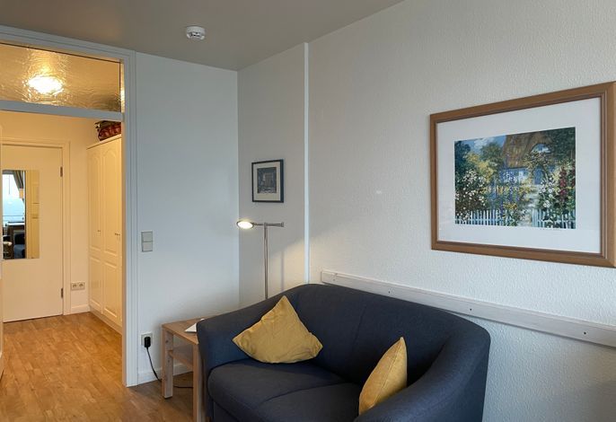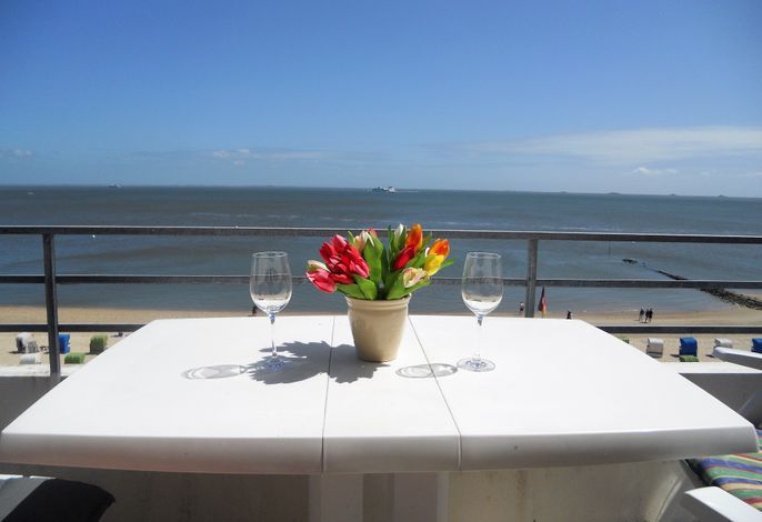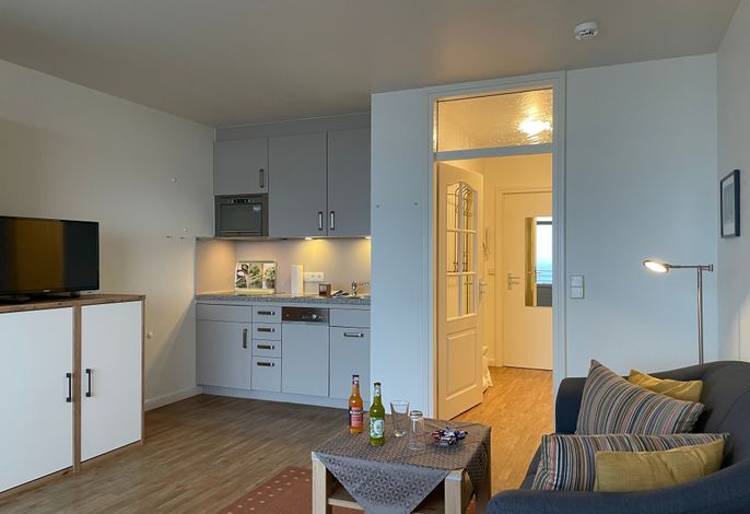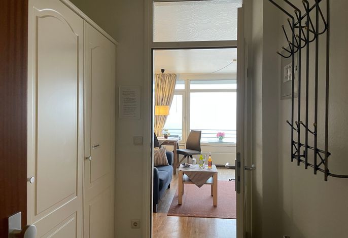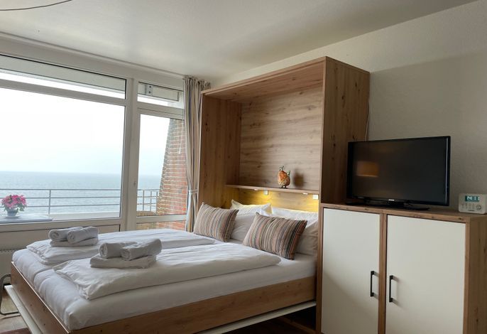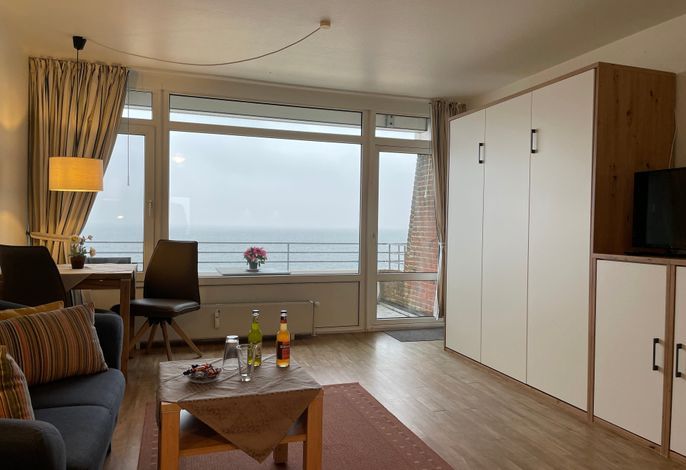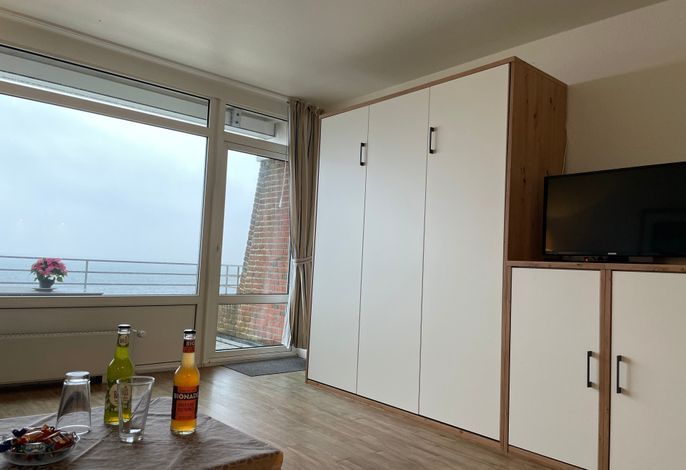 Im ruhigeren Abschnitt des belebten Sandwalls befindet sich das Haus Klaar Kiming direkt vor der Strandpromenade. In wenigen Minuten sind Sie mitten im Geschehen und können die vielen freundlichen Cafés und Restaurants besuchen, in den kleinen Geschäften bummeln gehen oder sich im Aquaföhr vergnügen. Im Haus befindet sich eine Waschmaschine und Trockner, die gegen eine geringe Gebühr zur gemeinschaftlichen Nutzung bereitsteht. Vom Keller aus gelangen Sie durch einen zweiten Eingang (Ostern bis Ende Oktober wetterabhängig) auch direkt an die Promenade und den Strand. Die Wohnungen bieten hier einen herrlichen Blick über das Meer und Sie können die Fähren, die Möwen und Ebbe und Flut vom Balkon oder der Terrasse aus beobachten. Unsere gemütliche Wohnung Klaar Kiming 5b befindet sich im 5. Obergeschoss des Hauses, welche Sie bequem mit dem Aufzug oder sportlich über die Treppe erreichen können. Der lichtdurchflutete Wohnschlafraum mit integrierter Küchenzeile ist ausgestattet mit WLAN, Flachbild-TV, einer bequemen Sitzgruppe und einem Esstisch, der sich direkt vor der Fensterfront befindet und Sie schon beim Frühstück mit dem Anblick des Meeres verwöhnt. Die im Wohnzimmer integrierte Küchenzeile ist ausgestattet mit einem Ceranfeldherd, einer Mikrowelle mit Grillfunktion, Geschirrspüler und einem Kühlschrank mit Gefrierfach. Das Doppelschrankbett (160x200cm) verspricht ruhige Nächte und das kleine Badezimmer mit Dusche ist funktional und freundlich gestaltet. Der Balkon mit Markise bietet Ihnen den unvergleichbaren Blick über den Strand und das Meer, der zum Träumen einlädt. Des Weiteren können Sie direkt durch das Untergeschoss des Hauses auf die Strandpromenade gelangen und zwischen einem erlebnisreichen Arbeitstag und dem Abendessen noch eine Runde in der Nordsee schwimmen. Erleben Sie entspannte Urlaubstage auf unserer herrlichen Insel!