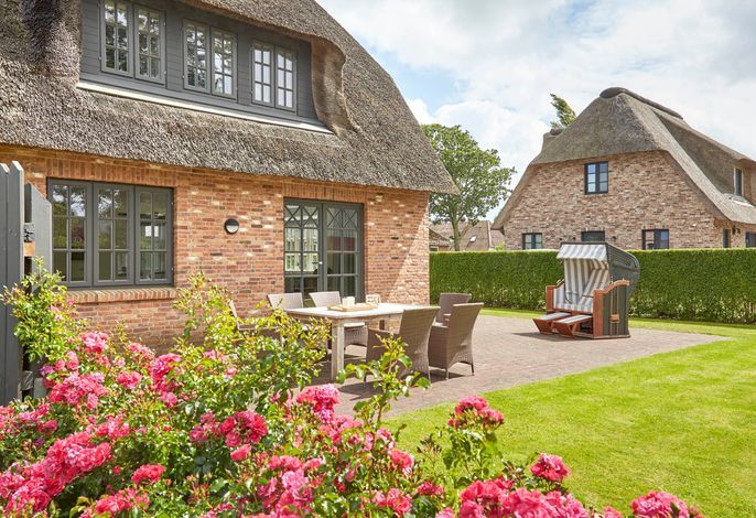 Willkommen in unserem exklusiven Reetdachhaus. Wohnen Sie auf Föhr Land im wunderschönen Dorf Oldsum mit dem Ambiente eines typisch friesischen Inseldorfes. Ein besonderes Wohnerlebnis erwartet Sie. Hier verbringen Sie Ihren Urlaub in einer großzügig und geschmackvoll ausgestatteten Haushälfte. Ob hochwertige Fliesen, Esstisch aus gekälkter Eiche in der Utlucht, eine Vollholzküche, hauseigene Sauna und der Mylin Kachelofen, an dem Sie es sich auf dem Ecksofa in Lederausstattung gemütlich machen - es fehlt einfach an nichts in diesem Urlaubsdomizil. Eine Terrasse (50qm) mit bequemen Möbeln, Sonnenschirm, Strandkorb und ein ca. 350qm großer Garten runden die Sache ab und lassen Sie jede Stunde Ihres Urlaubes genießen. Mehr auf