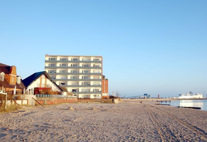 WOHNZIMMER: 1 Sessel, Sofa, Esstisch mit 4 Stühlen, SAT-TV und 2 Schrankbetten. SCHLAFZIMMER: 2 Einzelbetten und eingebaute Schränke. BAD: Dusche/WC. Das Haus verfügt über einen Fahrstuhl. Ein Parkplatz steht nur zur Verfügung, wenn ein Platz frei ist, es gibt fürs Haus 6 Parkplätze. Die Wohnung liegt zentral in der Fußgängerzone und hat einen sagenhaften Blick aufs Wasser und auf den Strand. Zum Wellenbad sind es ca. 10 bis 15 Minuten Fußweg.