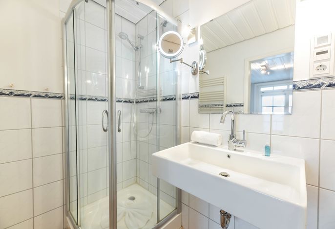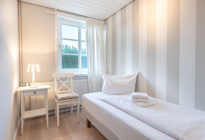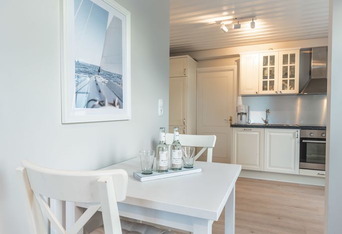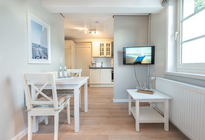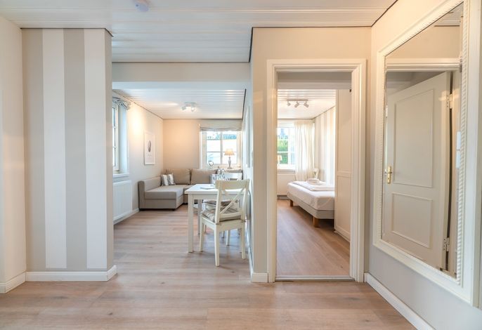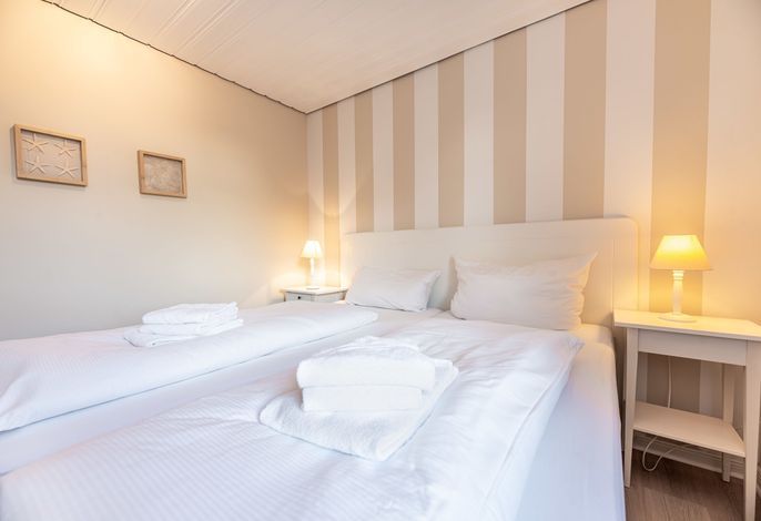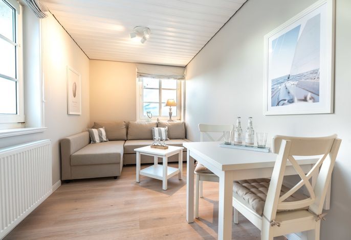 Dieses schöne Appartment verfügt über ein Elternschlafzimmer und ein Kinderschlafzimmer mit Einzelbett. Das Wohnzimmer ist mit einem Schlafsofa ausgestattet. Diese wunderschöne Ferienwohnung wurde 2022 von Grund auf saniert und mit tollen Extras wie USB/ USB Mini Steckdosen an jedem Nachttisch, integriertem Radio im Badezimmer, hochwertigen original Tempur-Matratzen ausgestattet, um Ihnen eine wunderbare Auszeit und die bestmögliche Entspannung bieten zu können. Direkt vor dieser Wohnung befindet sich ihre eigene Terrasse mit zartgrau gehaltenen Terrassenmöbeln und dem wohl besten Bäcker direkt gegenüber.