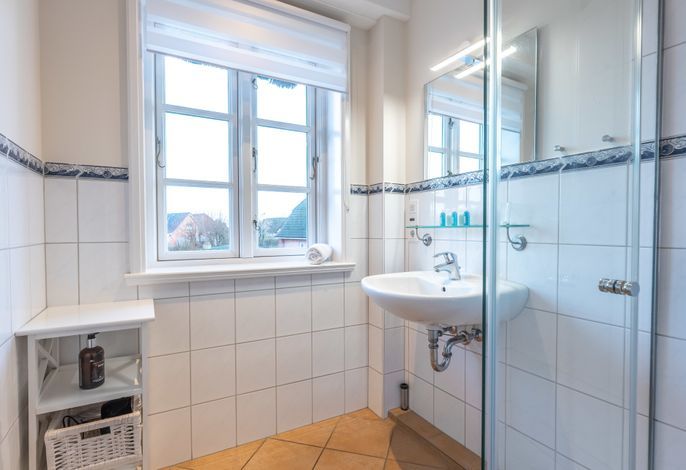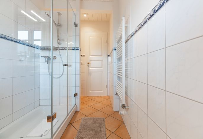 Das Bad mit Dusche und WC ist hell und lichtdurchflutet und zusätzlich mit einer Fußbodenheizung ausgestattet.