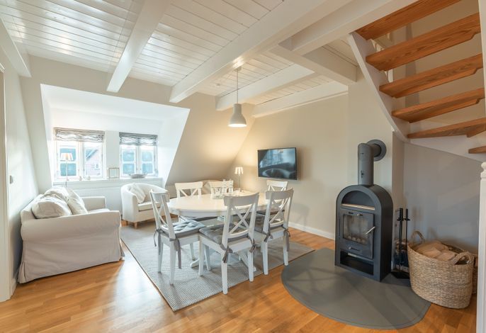 In dieser, gemütlich im nordischen Landhausstil eingerichteten Ferienwohnung steht Ihnen ein heller geräumiger Wohn- und Essbereich mit integrierter Küchenzeile zur Verfügung. Hier können Sie nach Herzenslust gemütliche Abende vor dem Kamin genießen und einfach mal die Seele baumeln lassen.