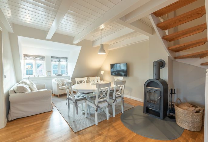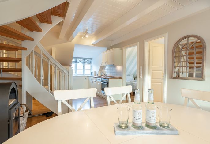 Eine Wohnung, die einen umarmt ist wohl die Beste Beschreibung eines Gastes, die den Charme dieser Wohnung beschreiben würde. Liebevoll wurde diese Wohnung 2022 von Grund auf saniert und verfeinert. Zarte beige Töne kombiniert mit hellen Landhausmöbeln verleihen ihr ein einzigartiges Wohlfühl-Ambiente. Neben einem großzügigen Eingangsbereich mit Garderobe verfügt über zwei Schlafzimmer mit Doppelbett und einem weiteren 140 cm breiten Bett, welches sich ideal für ein oder zwei Kinder eignet. Viele ausgefallene Details warten hier auf Sie, wie beispielsweise USB/ USB Mini Steckdosen an jedem Nachttisch, integriertem Radio im Badezimmer, hochwertigen original Tempur-Matratzen sowie einem 43 Zoll Fernseher. Im hauseigenen Hortensiengarten befinden sich viele schöne Sitzgelegenheiten, um die Sonnenstunden bestmöglich genießen zu können und gemütlich Café und Kuchen zu essen. Auf ihre Kinder wartet mit unserer tollen Boots- Sandkiste ein großes Abenteuer und viel Spaß.