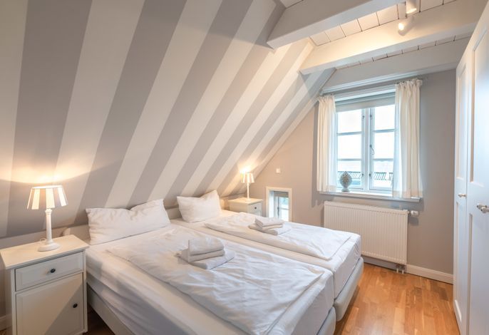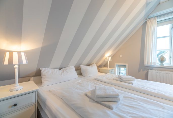 Die zwei Schlafzimmer mit jeweils einem Doppelbett (Liegefläche 180×200, oder einzeln gestellt jeweils 90×200) laden zum Schmökern und Träumen ein. Die Kissen und Bettdecken sind für Allergiker geeignet.