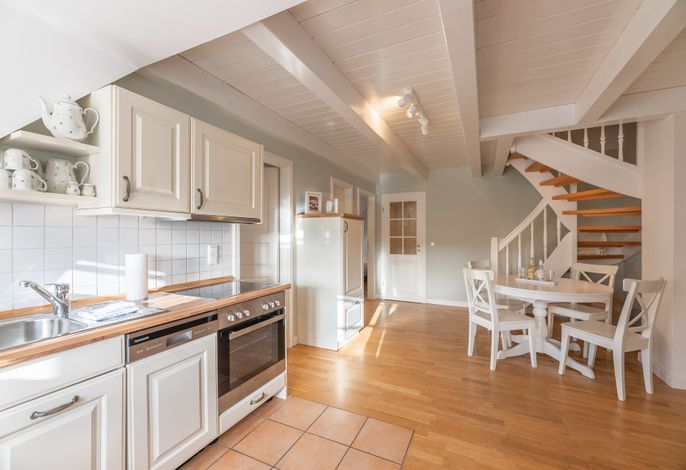 In dieser, gemütlich im nordischen Landhausstil eingerichteten Ferienwohnung steht Ihnen ein heller geräumiger Wohn- und Essbereich mit integrierter Küchenzeile zur Verfügung. Hier können Sie nach Herzenslust gemütliche Abende vor dem Kamin genießen und einfach mal die Seele baumeln lassen.