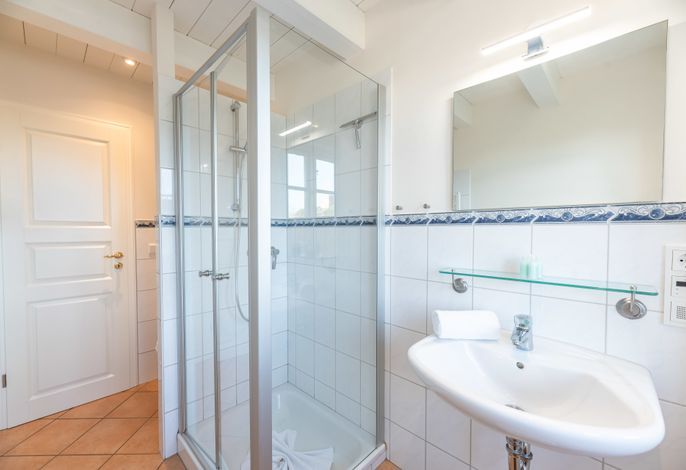 Das Bad mit Dusche und WC ist hell und lichtdurchflutet und zusätzlich mit einer Fußbodenheizung ausgestattet.