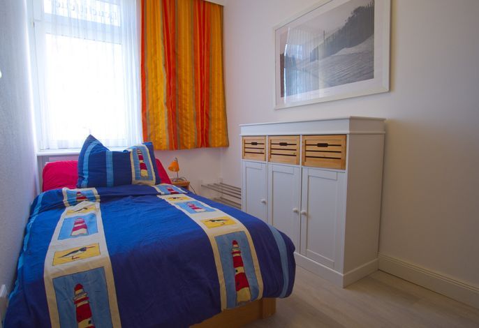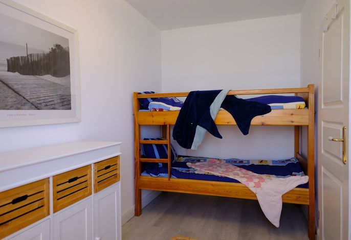 Im Erdgeschoss finden Sie das gemütliche Elternschlafzimmer, das mit einem direkten Zugang zur Terrasse ausgestattet ist – ein perfekter Ort, um den Tag bei einem Frühstück mit Meerblick zu beginnen. Das Elternbett hat die Maße 1,80 x 2,00 m und verfügt über ein offenes Fußende für zusätzlichen Komfort. Ebenfalls im Erdgeschoss befindet sich ein weiteres Schlafzimmer mit einem Einzelbett (1,00 x 1,90 m),einem Etagenbett