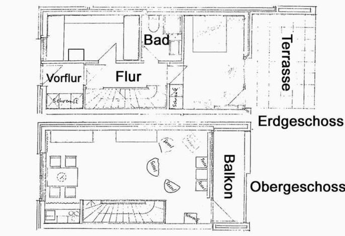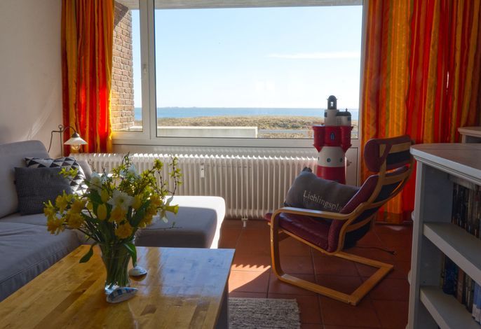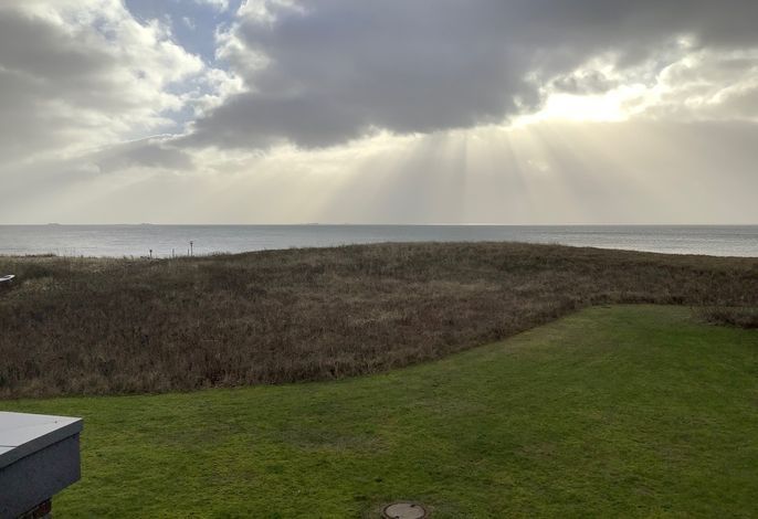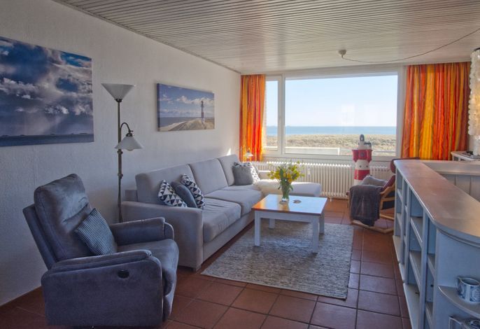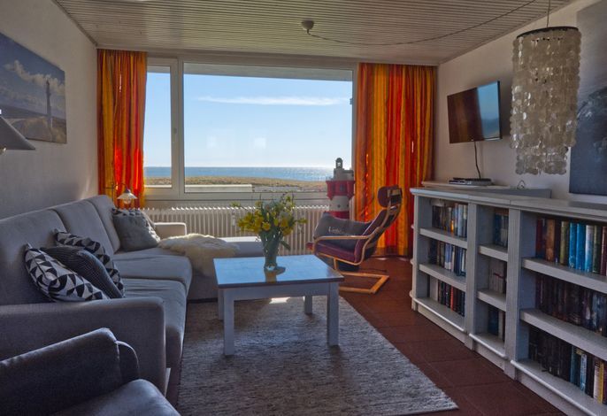 Über eine Treppe gelangen Sie in das erste Obergeschoss, wo sich der offene Wohnbereich befindet. Hier können Sie sich auf dem großen Sofa entspannen, während Sie den malerischen Blick auf die Nordsee genießen. Der Bereich ist perfekt für gemütliche Stunden, und die große Auswahl an Büchern sowie Spiele sorgen für Unterhaltung. Vom Wohnbereich aus haben Sie Zugang zu einem Balkon, auf dem Sie den Sonnenuntergang in vollen Zügen genießen können.