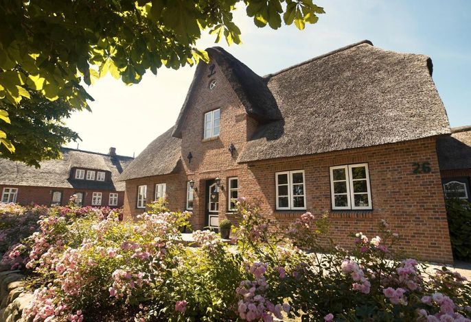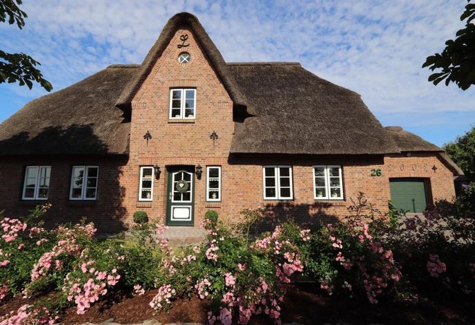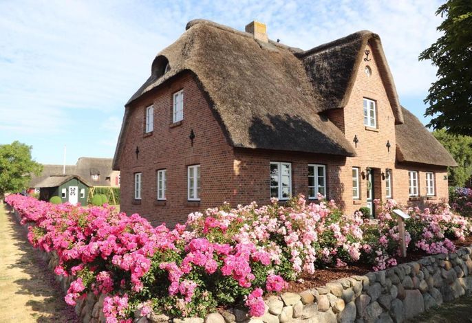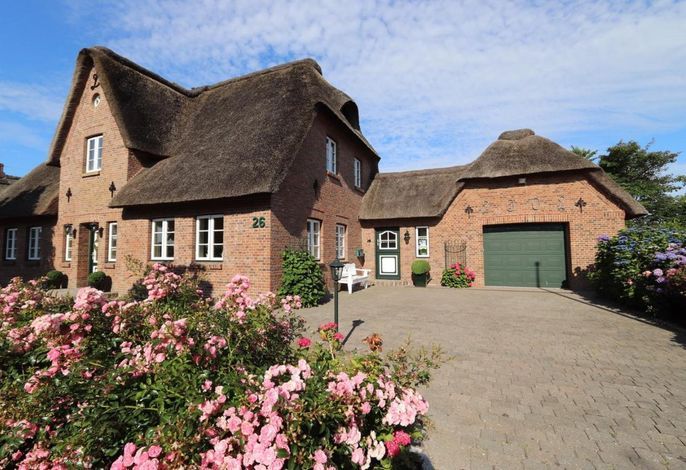 Pure Wohlfühlatmosphäre garantiert dieses, 2002 auf einem 1.500 m² großen Grundstück errichtete, exklusive Reetdachhaus. Die Räume sind offen gestaltet und lichtdurchflutet. Im Erdgeschoss kommt man von der großzügigen Diele in ein gut 40 m² großes Wohnzimmer, in eine geräumige Küche mit Ess-Ecke, in ein Arbeitszimmer und ein Duschbad. Ein doppelter Kachelofen und beheizte, durchgängig geflieste Fußböden sorgen für Behaglichkeit an kühleren Tagen. An die Küche schließt sich ein Hauswirtschaftsraum mit Nebeneingang an. Im Obergeschoss befinden sich drei große Schlafzimmer und zwei Bäder, davon eines en Suite mit Wannenbad und Regenduschen. Vom Wohnzimmer und vom Hauswirtschaftsraum geht es hinaus auf die sonnigen Terrassen mit Wind- und Sichtschutz, wo ein XL-Strandkorb und diverse Gartenmöbel warten. Umrahmt wird das Lunhüs von einem inseltypischen Friesenwall und einem gepflegten Garten. Die Ökoofen-Pelletheizung modernster Bauart, gekoppelt mit Solarthermie im Garten, sorgt für wohlige Wärme aus regenerativer Energie. Eine Bio-Infrarot-Saunakabine im Gartenhaus lädt zum Entspannen ein.
