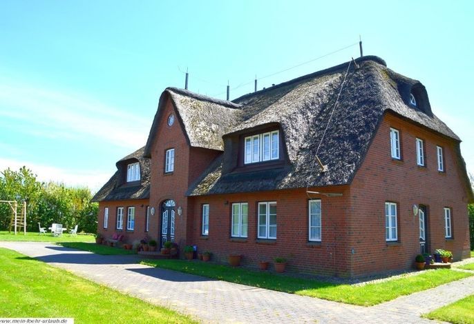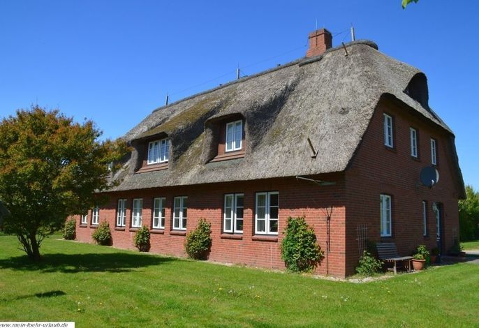 Das reetgedeckte Haus im Friesenstil mit 3 Ferienwohnungen und Ausblick in die freie Natur ist kinderfreundlich und liegt etwa 10 Gehminuten vom Wasser entfernt.