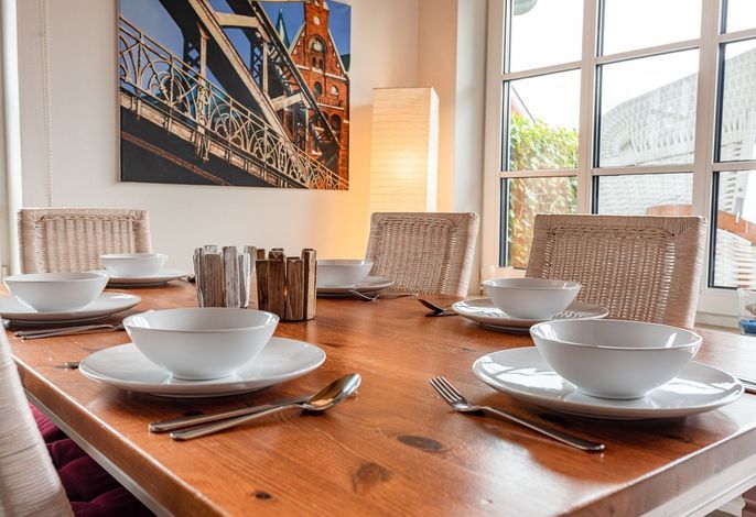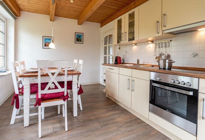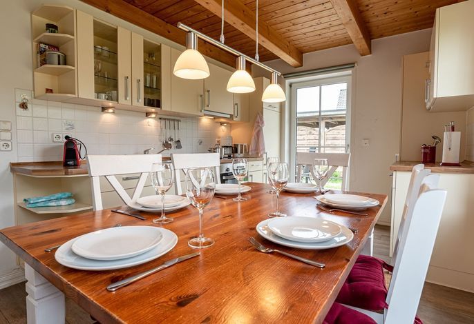 Einen großen Wohn-Essbereich und eine separate Küche mit einem Essplatz.