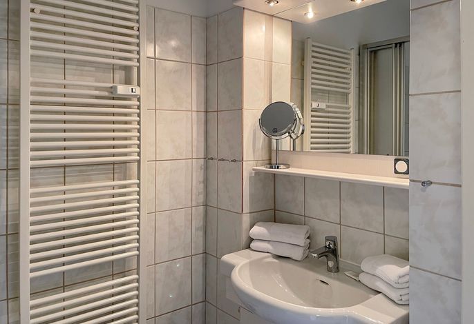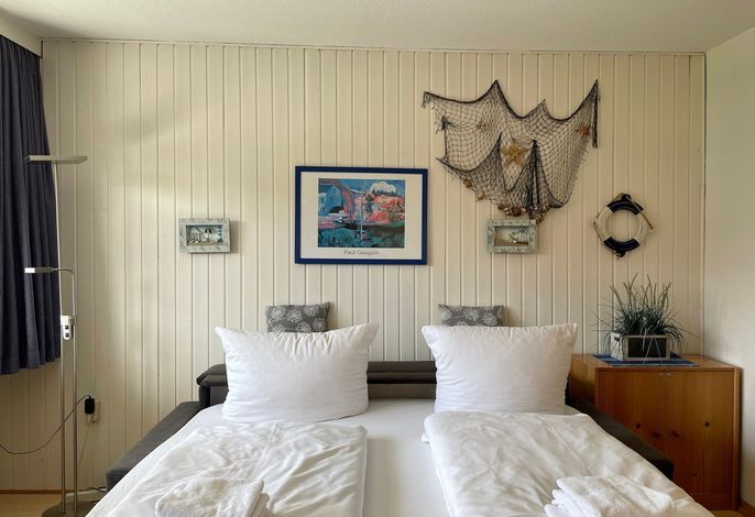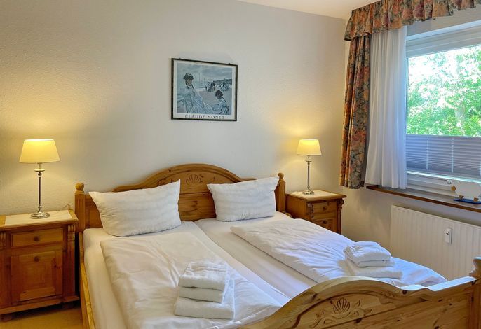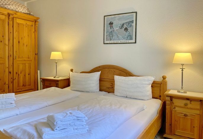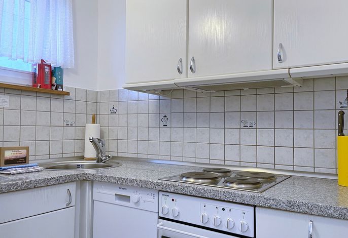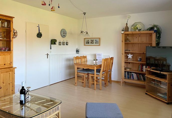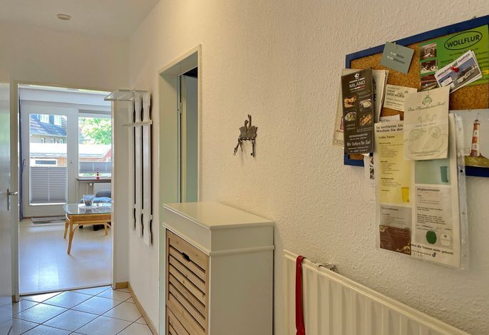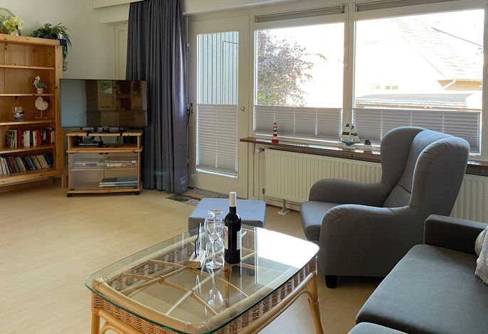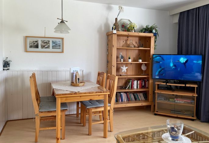 Am Rande von Wyk befindet sich das Matthias-Petersen- Haus mit 30 Wohneinheiten. Die Erdgeschosswohnung Nummer 1 lädt 2-4 Personen zu herrlichen Urlaubstagen ein. Abgehend vom Flur erreichen Sie alle Zimmer. Der helle Wohn- Essbereich mit WLAN, Flachbild-TV, DVD- und Video-Player und einer kleinen Auswahl an Büchern wirkt durch viele maritime Accessoires behaglich und gemütlich. Das neue Schlafsofa mit Bettkasten (1,70 x 190 cm) bietet eine Schlafgelegenheit für eine 3. und 4. Person. Vom Wohnzimmer gelangen Sie auf den überdachten, windgeschützten Balkon und können den Tag gemütlich ausklingen lassen. Das helle Bad mit Dusche und Handtuchheizkörper ist funktional ebenso wie die separate, offene Küche mit Geschirrspüler, Backofen, Kühlschrank mit Gefrierfach, Wasserkocher, Kaffeemaschine und Toaster. Das separate Schlafzimmer mit geräumigem Kleiderschrank, Doppelbett (180x200cm)und Fenster sorgt für erholsame Träume. Genießen Sie entspannte Urlaubstage! Das Haus selbst verfügt über einen gemeinschaftlich nutzbaren Parkplatz und eine große Liegewiese mit Grillhütte und Grill. Fahrradständer stehen zur Verfügung. Im Untergeschoss des Hauses, das Sie mit einem Aufzug oder per Treppe erreichen können, befinden sich neben der Waschküche mit Waschmaschine, Trockner (gegen Gebühr) und Wäscheleine auch ein Angebot an Beschäftigungsmöglichkeiten. So können Sie kostenfrei ein Workout im kleinen Fitnessraum machen. Für Entspannung sorgt die gemeinschaftliche Sauna ( gegen Gebühr), bei der Sie Ihre Wunschzeit in einer Liste reservieren können. Der Bäcker und die Bushaltestelle befinden sich in fußläufiger Entfernung und der Südstrand lockt mit schönen Aussichten.