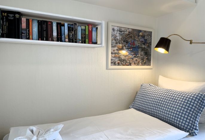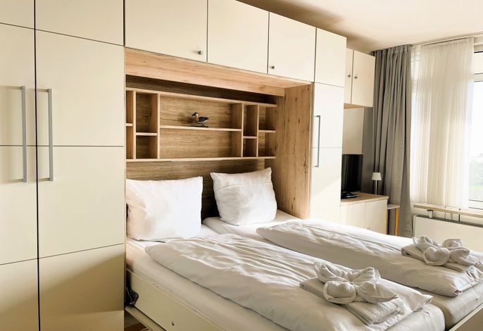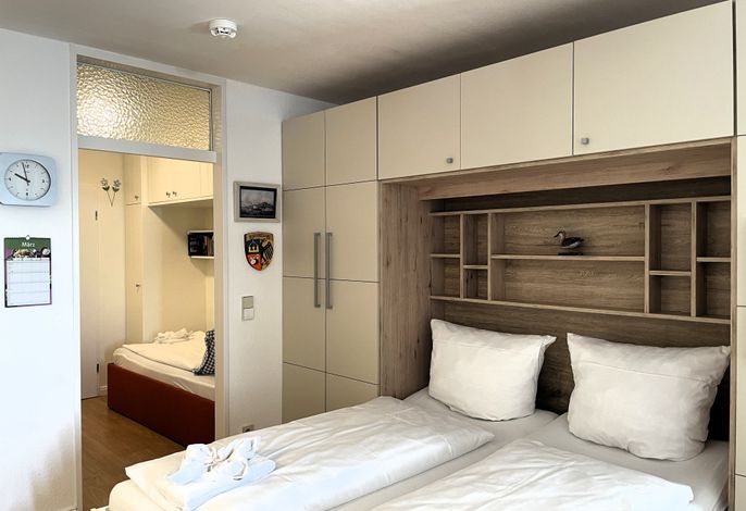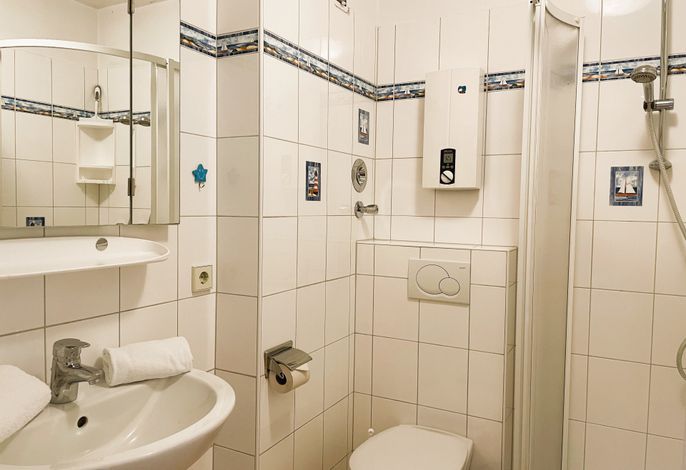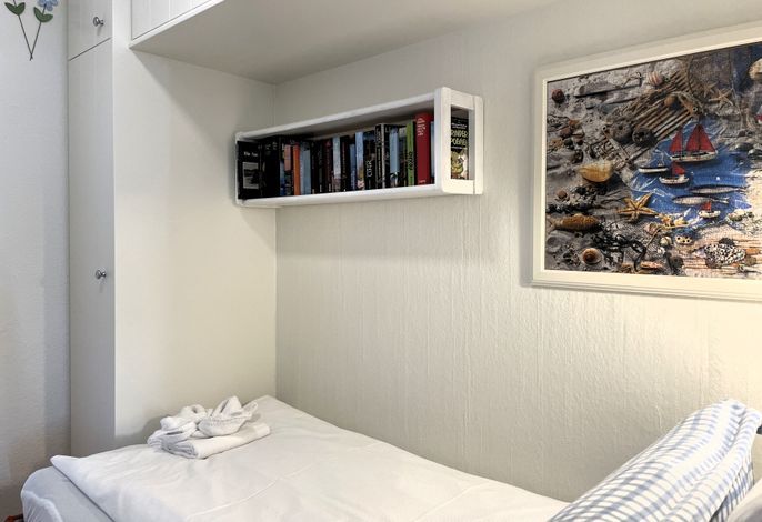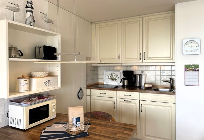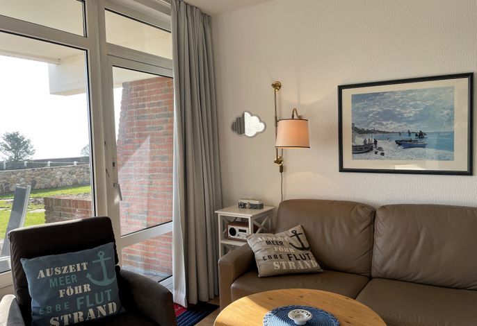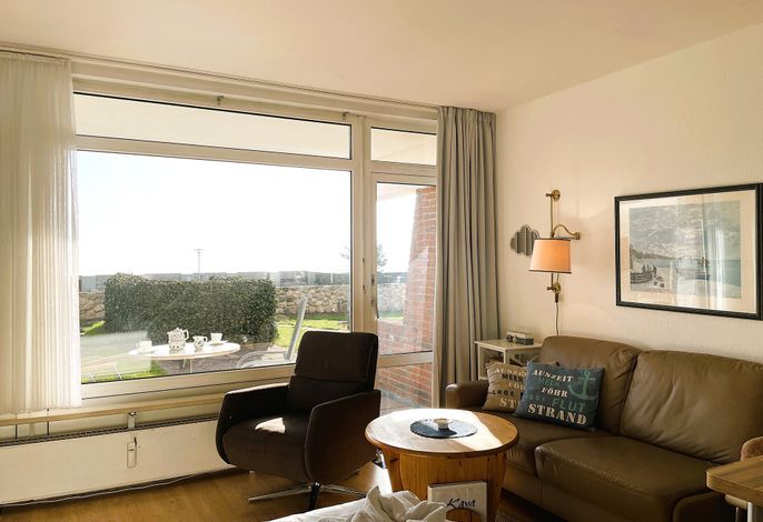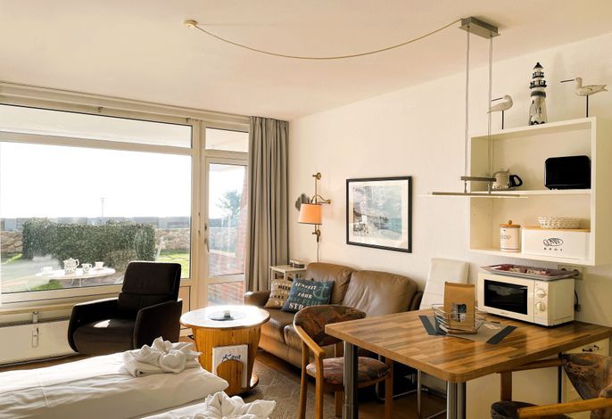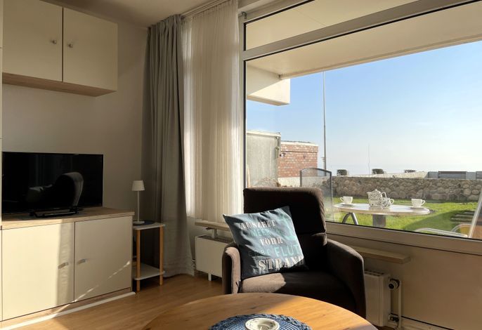 Das Appartement Meerblick 1b (ca. 33m) liegt im Erdgeschoss des Hauses und lädt zu herrlichen Urlaubstagen direkt am Strand ein. Genießen Sie das Frühstück auf der Terrasse mit großer Wiese und Blick auf das Meer. Der lichtdurchflutete Wohnraum ist freundlich gehalten und besteht aus einer gemütlichen Sitzecke, einem hochwertigen Schrankbett (160x200cm) und einer Küchenzeile mit angrenzendem Essplatz. Liebevolle Details schenken der Wohnung Ihren besonderen Flair. Im Flur befindet sich ein weiteres Bett 90x190cm) für eine Person falls Sie dort Ihren Mittagschlaf genießen möchten oder als Ausweichmöglichkeit für die Nächte. Das Bad ist hell gefliest und funktional. Genießen Sie ein Appartement in exklusiver Lage!