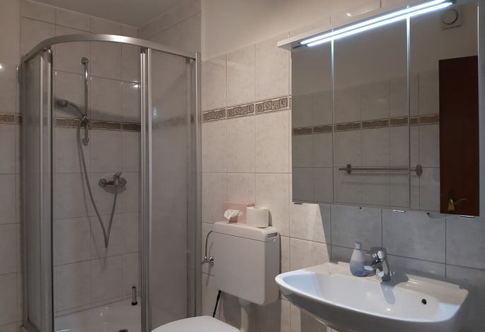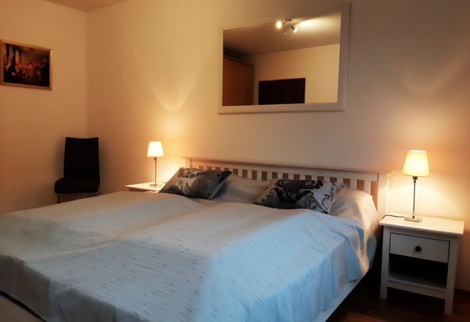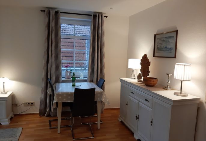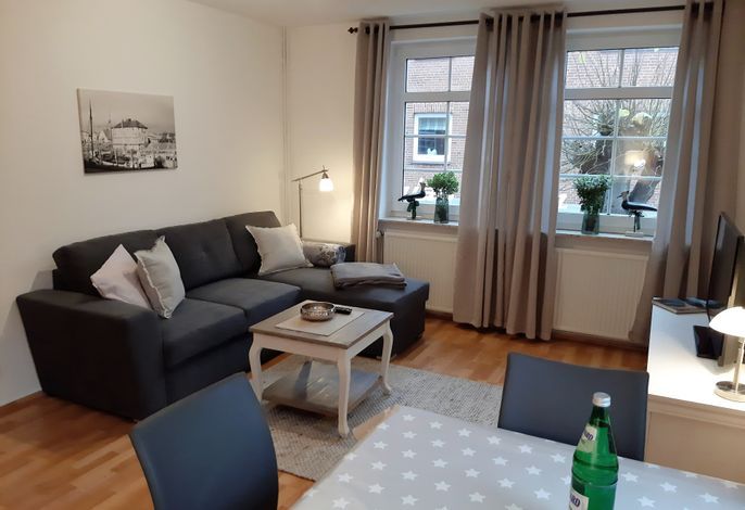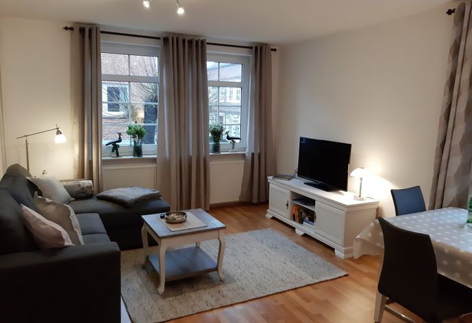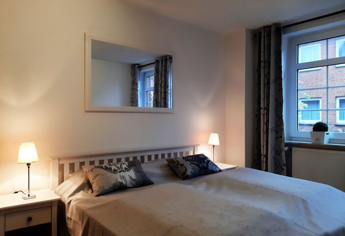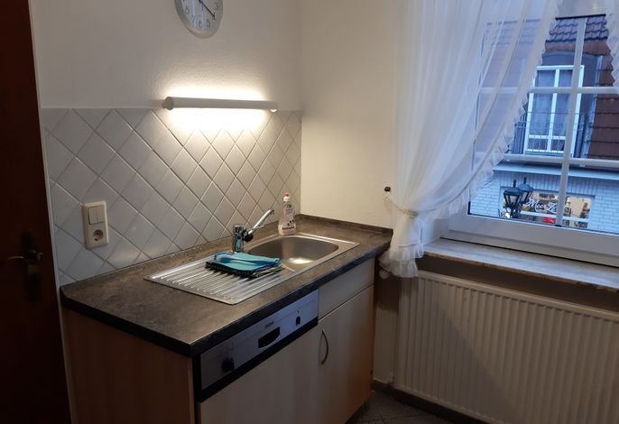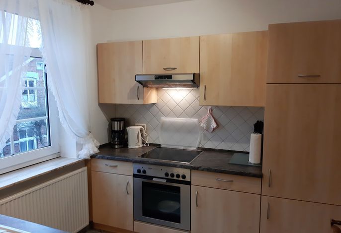 Mitten in der Innenstadt, nur 100m vom Strand entfernt, befindet sich im 1. Obergeschoss diese 50qm große Ferienwohnung. In der separaten Küche findet man alles, was man zum Kochen braucht, sowie einen Backofen, Geschirrspülmaschine und einen Kühlschrank mit Gefrierfach. Das Doppelbett im Schlafzimmer hat eine Größe von 1,80x2,00m. Der Wohn- Essbereich bietet genügend Platz und ist mit einem Radio und einem LED-TV ausgestattet. Das gemütliche Sofa mit Schlaffunktion lädt zum Verweilen ein und bietet einen zusätzlichen Schlafplatz für eine Person. Im Badezimmer befindet sich eine Dusche, WC, Waschbecken und ein Föhn. Bettwäsche und Handtücher sind für 25 Euro pro Person inklusive.