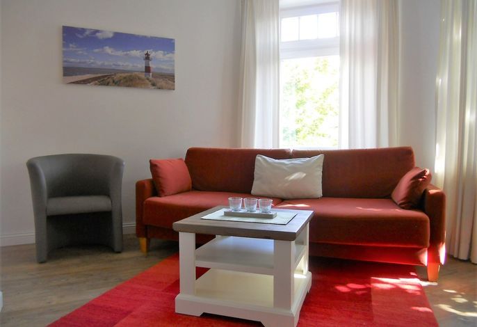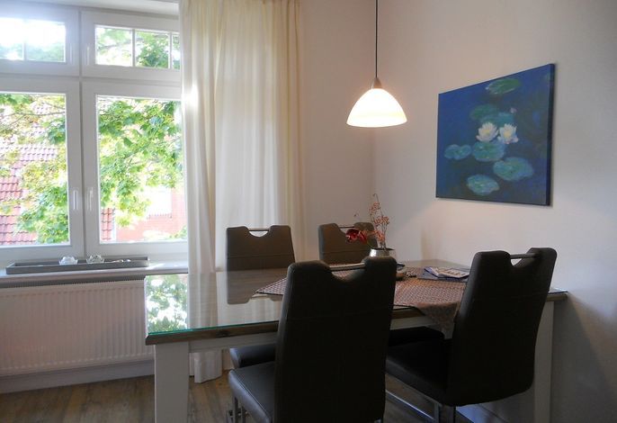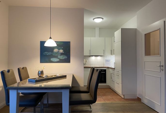 Das Galeriehaus ist ein historisches Gebäude von Wyk, welches außen immer noch den einstigen Charme von vergangenen Zeiten aufweist, doch innerhalb der Fassade umgebaut und renoviert wurde. Jetzt befinden sich im Galeriehaus 4 Wohnungen für je 2 Personen. Die zentrale Lage zur Innenstadt, dem Strand und der Nordsee, dem Meerwasserwellenbad Aqua Föhr und zu den Einkaufläden machen unsere Wohnungen im Galeriehaus sehr beliebt. Unsere kleine, hübsche Obergeschoßwohnung Monet eignet sich mit 40 qm ideal für 2 Personen. Der offene Wohnraum mit integrierter Küchenzeile und Essplatz ist hell und freundlich gestaltet. Die großzügige Essecke bietet Platz für ein reichhaltiges Frühstück am Morgen und abends lädt die bequeme Couch dazu ein, gemeinsam einen Film zu schauen oder ein gutes Buch zu lesen. Die kleine Küchenzeile ist gut ausgestattet und verfügt über einen Ceranfeldherd mit Backofen, einen Kühlschrank mit Gefrierfach; Wasserkocher und Kaffeemaschine sind natürlich ebenfalls vorhanden. Das Badezimmer ist funktional hergerichtet mit Dusche, Handtuchheizung, Schminkspiegel und Föhn. Das Schlafzimmer, ausgestattet mit Boxspringbett und geräumigem Kleiderschrank, ist nach hinten hinaus gelegen und lädt zu schönen Träumen ein.