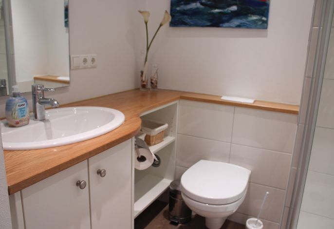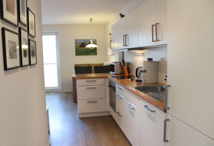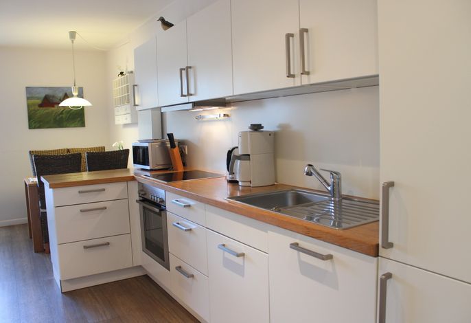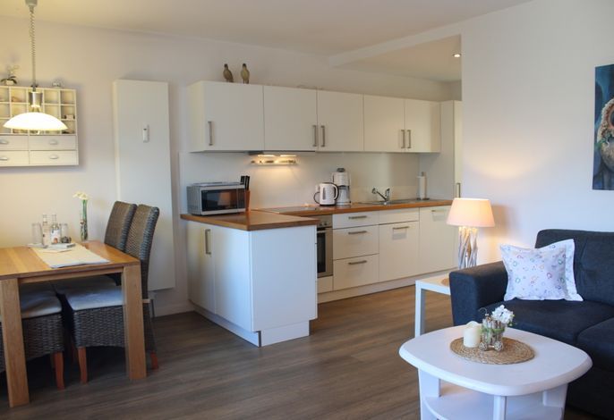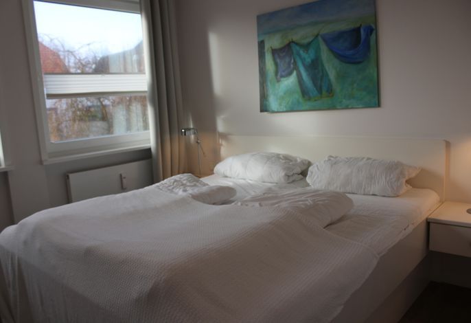 Ein separates Schlafzimmer mit großem Doppelbett, das helle Duschbad und die Küchenzeile sind mit allem Komfort ausgestattet.