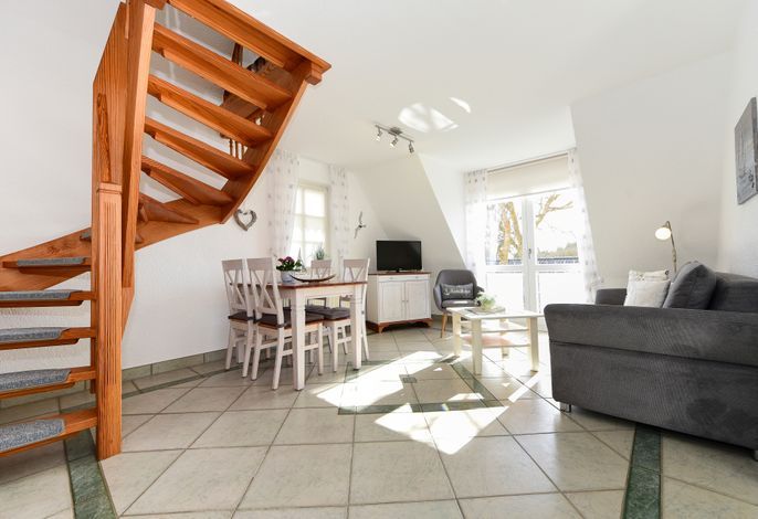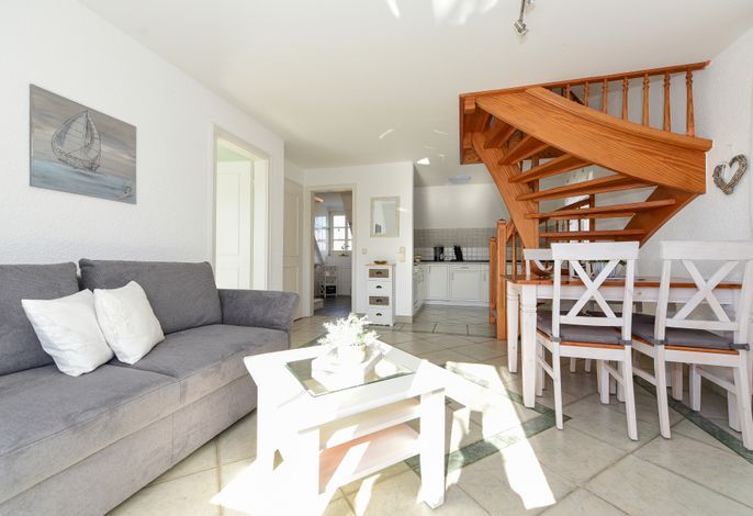 Die Ferienwohnung besticht durch ihren hellen und einladenden Wohn- und Essbereich, der ideal für gemütliche Abende oder gemeinsame Mahlzeiten ist. Für Ihre Unterhaltung stehen Ihnen ein LCD-Fernseher, ein DVD-Player, eine Stereoanlage sowie kostenloses WLAN zur Verfügung. An Regentagen können Sie sich zudem an der Telefonflat ins deutsche Festnetz erfreuen.