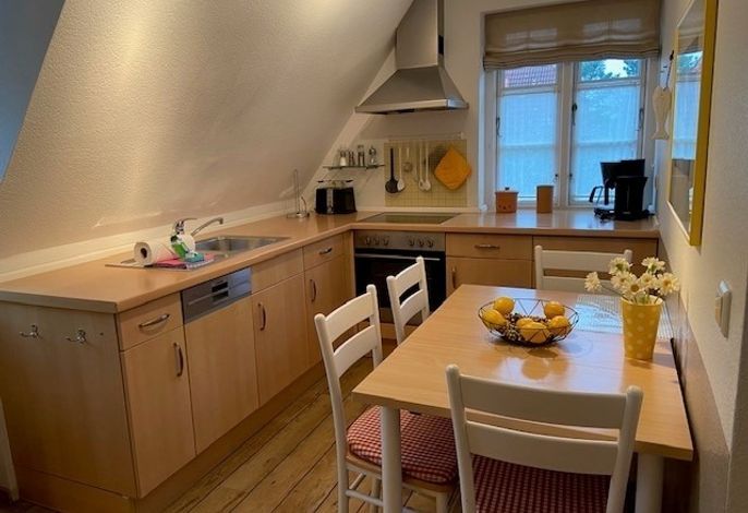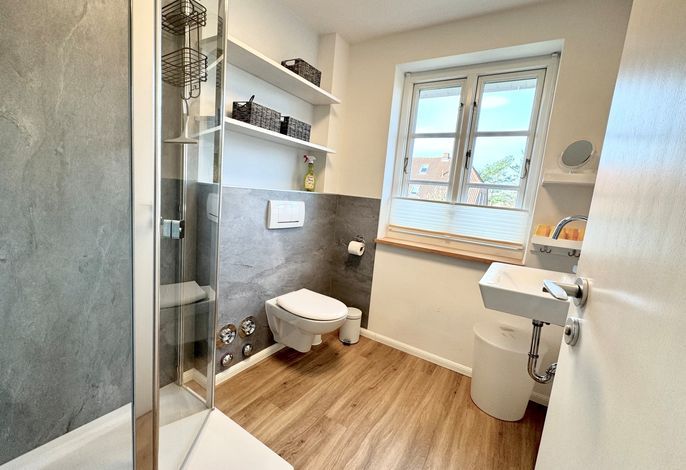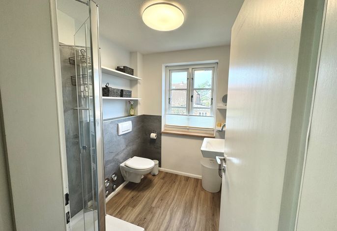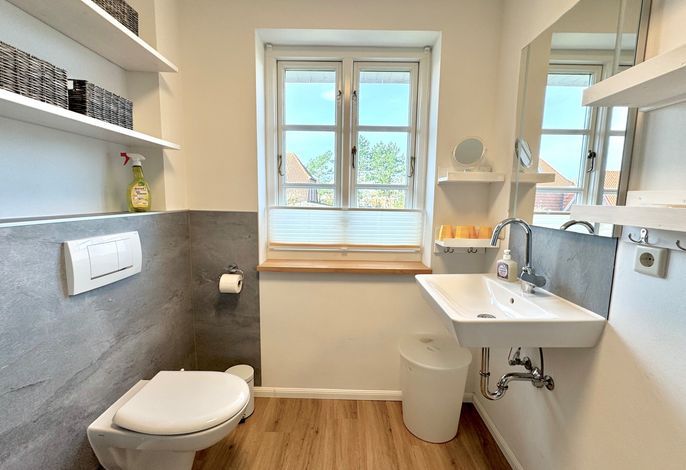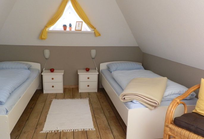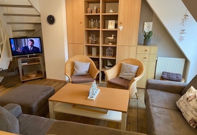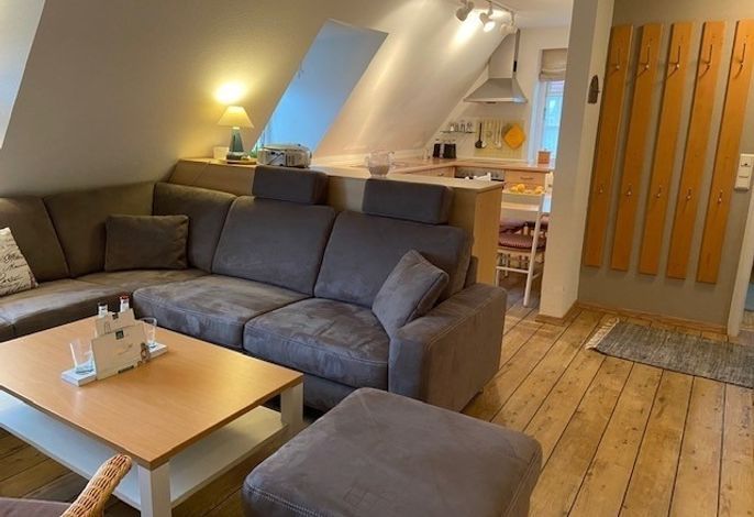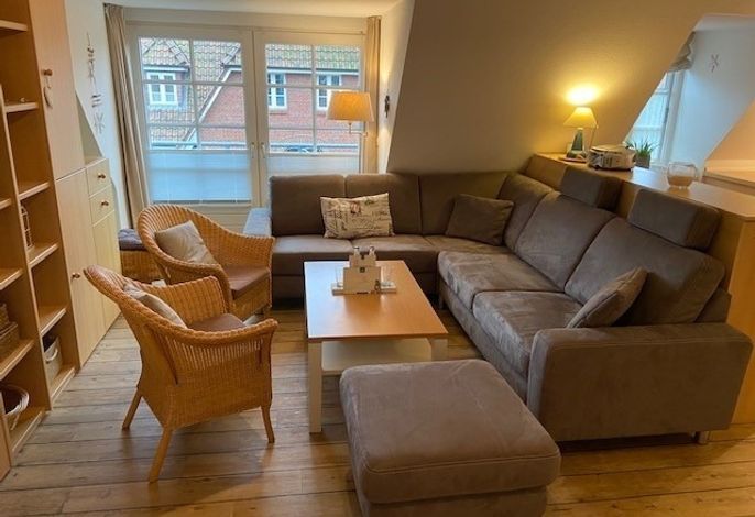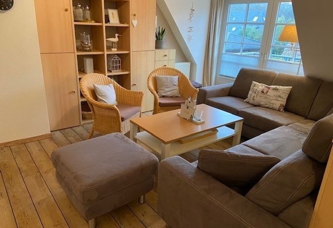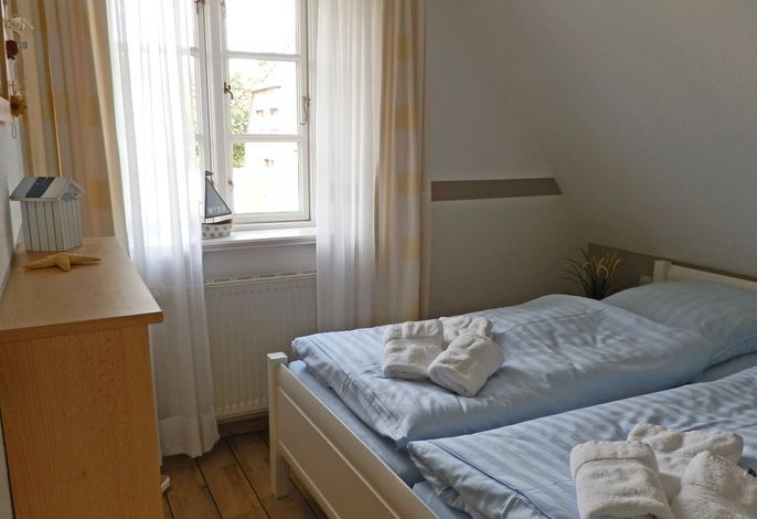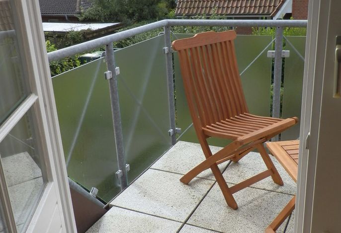 Die gemütliche und geschmackvoll eingerichtete Obergeschoss-Wohnung für 2 bis 4 Personen. Über den großzügigen Eingansbereich gelangen Sie in das helle Wohnzimmer mit anschließendem offenen Küchenbereich. Hier befindet sich auch das Duschbad und das Schlafzimmer mit Doppelbett. Das zweite Schlafzimmer ist mit zwei Einzelbetten ausgestattet. Der nach Süden ausgerichtete Balkon bietet den ganzen Tag lang Sonne zum Kaffeetrinken oder um mit einem Sundowner den Abend in Ruhe zu beenden.