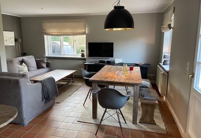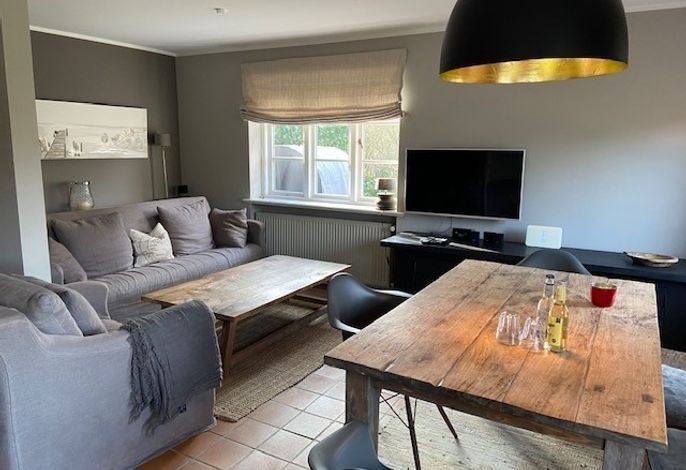 Vom Wohnbereich aus haben Sie einen direkten Zugang in den Garten auf die Süd-West-Terrasse mit Gartenmöbeln und Strandkorb.