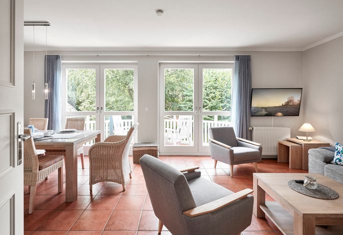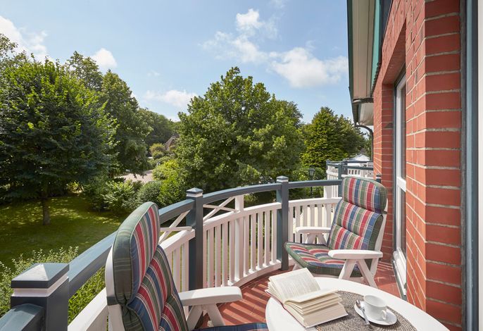 Die Ausstattung der Ferienwohnung hat alles was ein Urlaub mit der Familie braucht. Auf dem Balkon einen Kaffee oder ein Glas Wein genießen und in den alten Kurpark blicken.