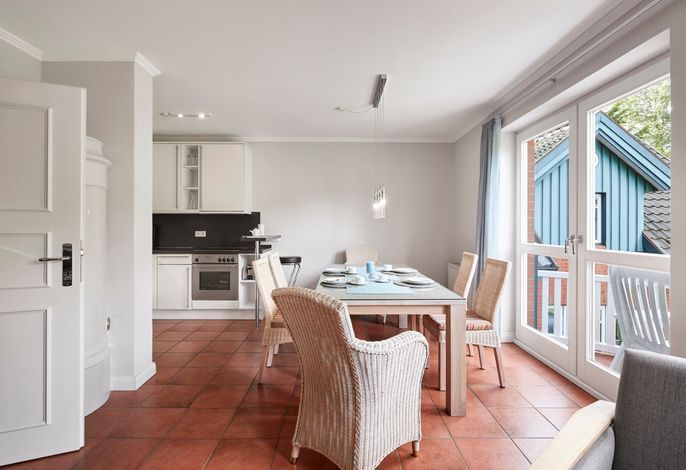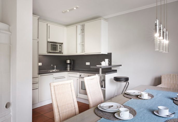 Besonders gemütlich wird es dank des Mylin Kachelofens und die offene Küche bietet Platz zum gemeinsamen Kochen und Essen.