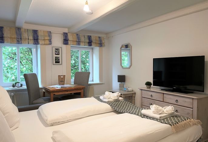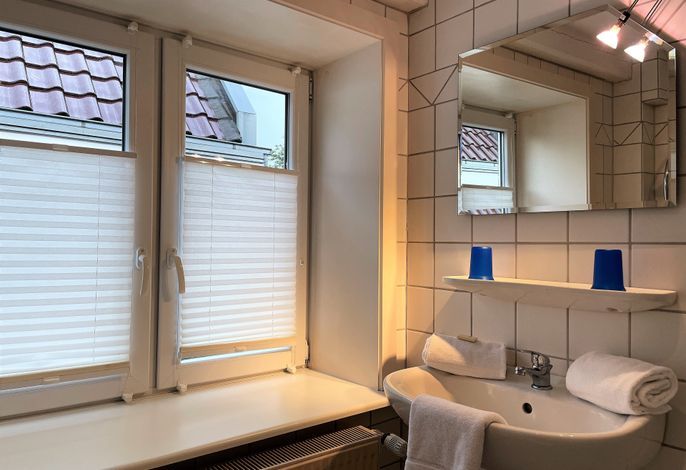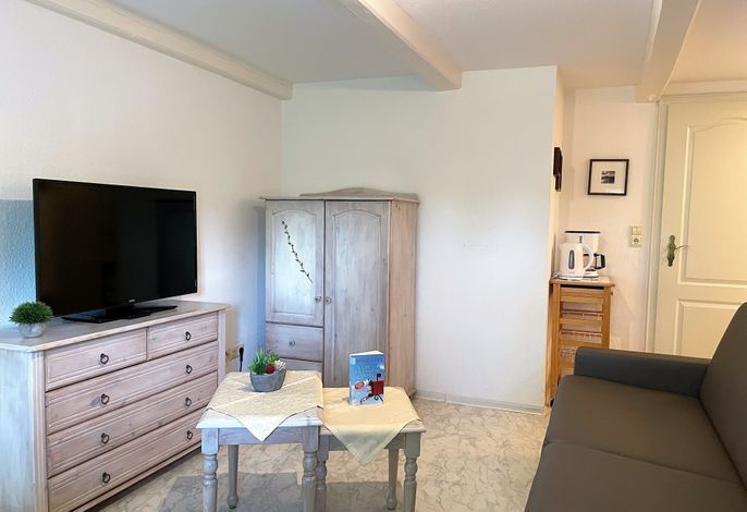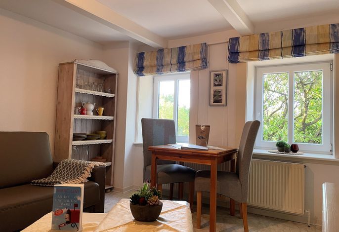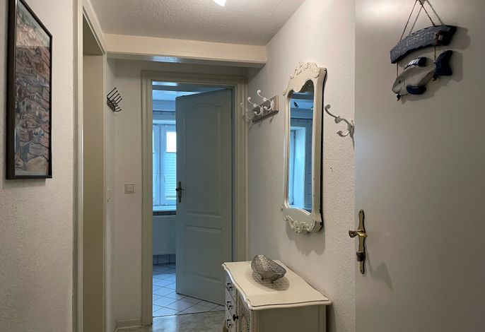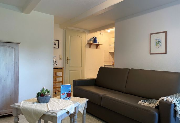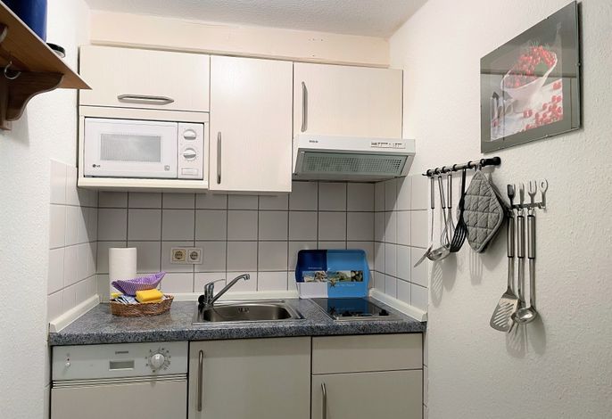 Die kleine, gemütliche Ferienwohnung Nordwind ist ein 1-Raum-Appartement mit Küchennische und einem Wohnschlafraum. Die Couch kann ausgezogen werden (Liegefläche 170cm x 195 cm) und der Essplatz am Fenster lädt zu gemütlichen Stunden ein. Das kleine Duschbad ist funktional und mit einem Fenster ausgestattet. Die Küche mit Mikrowelle, Ceranfeldherd mit zwei Kochplatten (ohne Backofen) und Geschirrspüler ist gut ausgestattet. Die moderne, liebevoll in Stil und Farben abgestimmte Einrichtung verleiht der Wohnung Ihren Charme und lässt Sie herrliche Urlaubstage erleben. Die Bäckerei, das Kino, gemütliche Cafés und Restaurants, der Edeka-Markt und viele kleine und größere Geschäfte befinden sich in unmittelbarer Umgebung genauso wie der Strand und das Meer natürlich..
