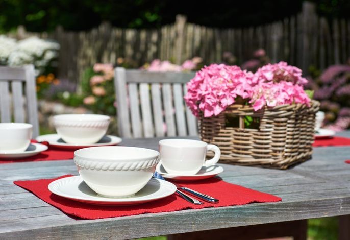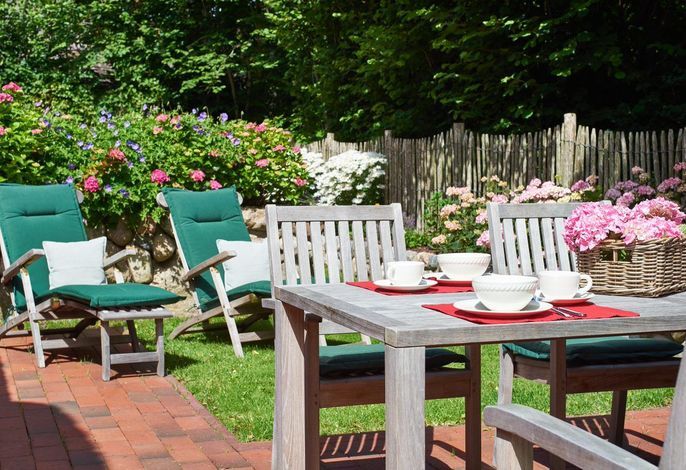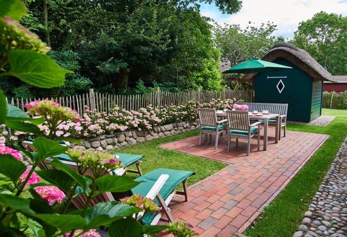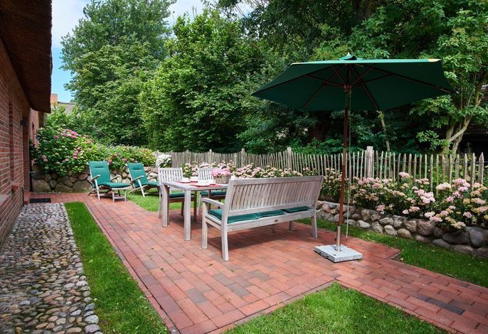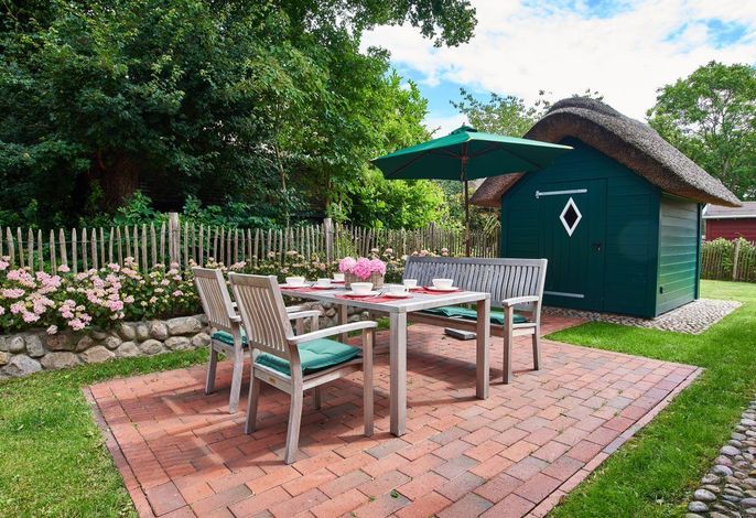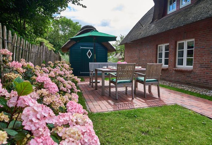 Im Außenbereich befindet sich der kompakte Garten mit Terrasse und hochwertigen Teak-Gartenmöbel. Ein reetgedecktes Gartenhaus bietet eine Unterstellmöglichkeit für Fahrräder und ist mit Steckdosen ausgestattet. Akkus von E-Bikes können hier direkt geladen werden. Ein PKW-Stellplatz rundet das Angebot des Außenbereiches ab.