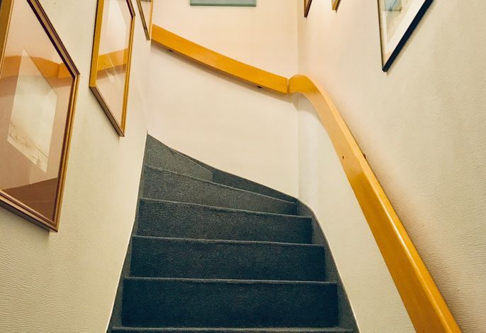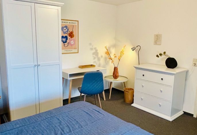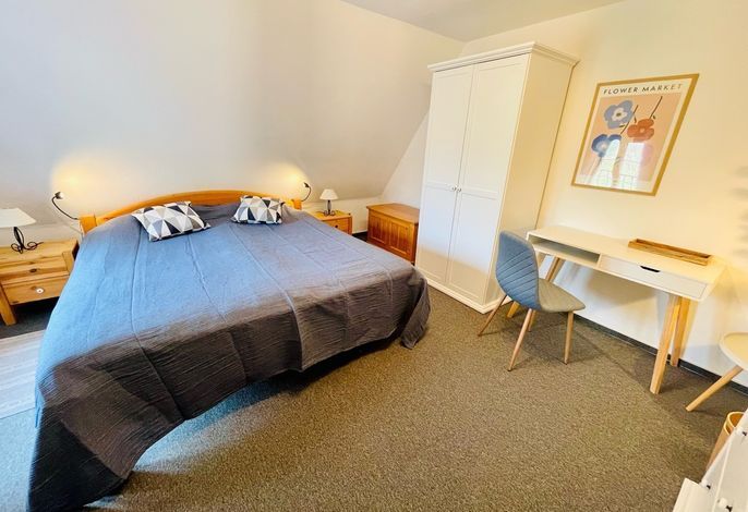 Im Obergeschoss gelangen Sie in den Schlafbereich mit einem 2 Meter breiten Doppelbett und einem kleinen Schreibtisch, sowie ins Duschbad.