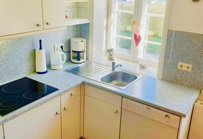 Im Erdgeschoss befindet sich die Einbauküche und der Wohn-/Essbereich mit Schlafsofa.