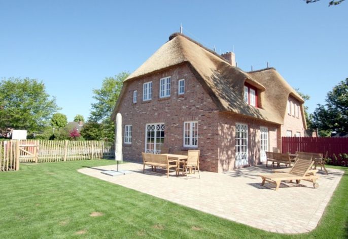 Ferienhaus in Wrixum auf Föhr, Ohl Dörp 55b, Wohnung Nr. 2: Gemütliche 4-Zimmer Doppelhaushälfte (ca. 140 qm) in einem Reetdachhaus. DTV Klassifizierung: 4 Sterne. NICHTRAUCHERHAUS. WOHNZIMMER: Sitzecke, Esstisch und komfortable Küchenzeile, Kaminofen. BAD 1 im EG: Dusche/WC. Eingangsflur und HWR. IM 1 OG befindet sich das BAD 2: Dusche/WC/Wanne und Sauna und 3 Schlafzimmer mit 2 x Doppelbett und 1 x 1 Bett. Die Wohnung ist dörflich, zur Marsch hin gelegen. Das Zentrum vom Wyk erreichen Sie in ca. 20 - 30 Min. Fußweg. Zum Strand sind es mit dem Fahrrad ca. 10 - 15 Minuten. Ein Bäcker ist in der Nachbarschaft. Bettwäsche und Handtücher werden inklusive gestellt. Parkplatz am Haus. Das Haus wurde mit sehr viel Liebe zum Detail ausgestattet und bietet mit der Terrasse und dem Garten (eingezäunt) viel Platz zum Wohlfühlen und Entspannen. Kinderbett und Hochstuhl auf Anfrage inklusive, Babyphone ist vorhanden. Internetanschluss WLAN-Kabel. Das Grillen ist wegen des Reetdaches nur mit einem Elektrogrill erlaubt.